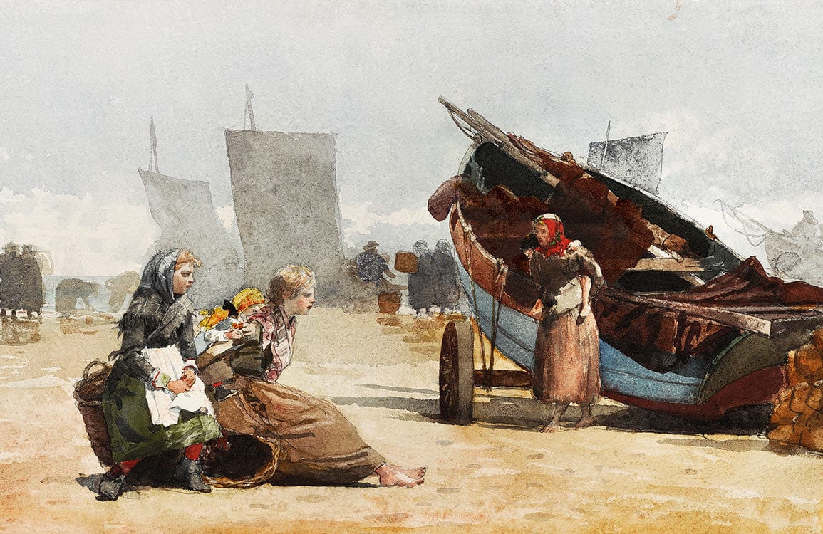 Immerse yourself in the tranquil essence of a bygone era with this Beach Scene Wallpaper Mural. Its masterful depiction of coastal life, with detailed figures set against the backdrop of robust fishing vessels, conjures a serene, pastoral charm. The meticulously painted scene captures the gentle bustle of shoreline life, infusing your space with an artistic narrative that's both nostalgic and timeless.