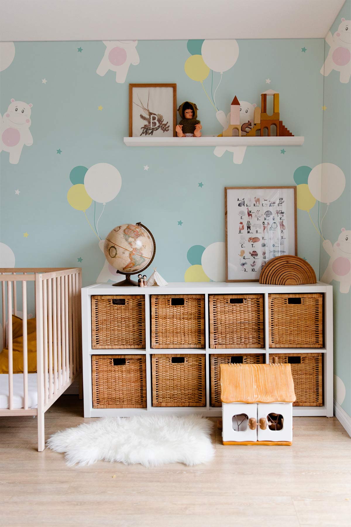 Give your new born a wonderful room to have in his early stages of life. Our lite bear and balloon design will fill your baby鈥檚 room with calmness and brightness. The baby blue colour is so eye comfort so it will be perfect for your baby early stages and to his eyes. This simple design of flying bears with balloons will make your baby attached to his room when he starts to know the colours and feel the sense of the lite shades in his new discovery of surroundings. These smiling bears are so perfect to be styled with white chiffon curtains and white baby bed or white decorations to complete the full look of cuteness.