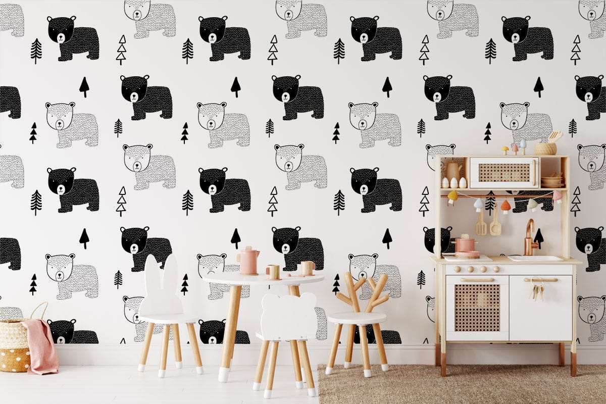 Immerse your space in the charming allure of the Bear & Forest Wallpaper Mural. This beautifully illustrated design features whimsical bears amidst delicate tree motifs, creating a narrative that evokes both tranquillity and adventure. The monochrome palette lends a sophisticated and timeless quality, making it an exquisite choice for diverse interior aesthetics.