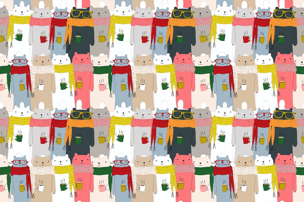 With this Bears Feel Cold Wallpaper Mural, transform your home into a winter wonderland that's full of warmth. The design features adorable bears wearing scarfs and drinking coffee, making it the perfect fit for any room in need of some extra coziness. This super-cute pattern lets you instill your baby's room with the right amount of cuteness and keep your little one warm and safe throughout the winter season. A fun theme for any child's bedroom, this wallpaper mural is easy to apply and remove and will make decorating your kids' room easy as pie!