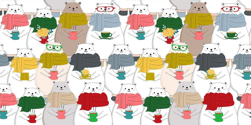 Bears Wear Scarf Wallpaper Mural presents an enchanting tapestry of whimsical bears clad in vibrant scarves, casually enjoying hot beverages. The playful yet sophisticated design adds character and charm, effortlessly complementing contemporary and Scandinavian aesthetics. The harmonious blend of light tones with splashes of rich colour makes it an admirable feature for any stylish interior.