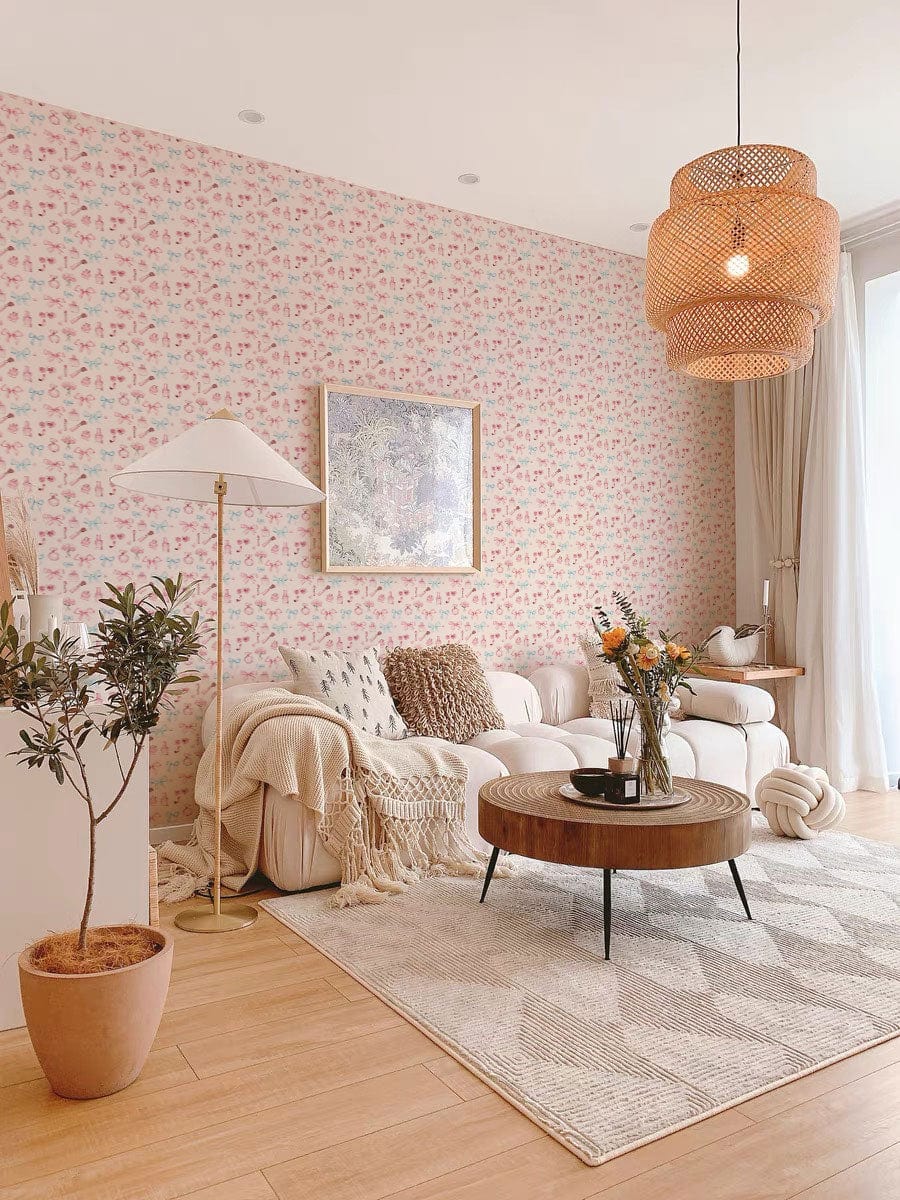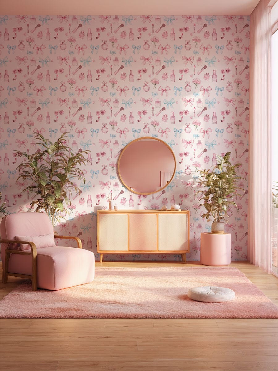 The Beauty and Bows Mural Wallpaper presents a delicate symphony of pattern and colour, featuring intricately arranged bows that evoke a sense of charm and whimsy. Its harmonious palette of soft pinks and calming blues is set against a pristine white backdrop, creating an inviting and graceful atmosphere. This artistic masterpiece is crafted to infuse spaces with timeless elegance, effortlessly complementing a range of interiors from classic to contemporary.