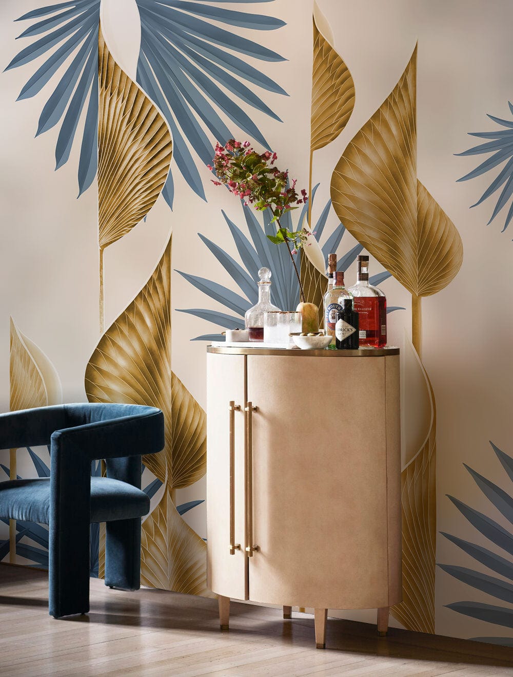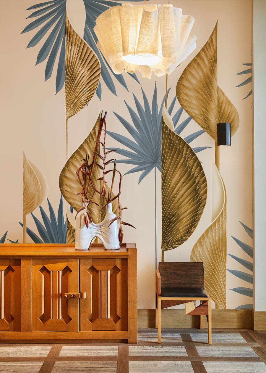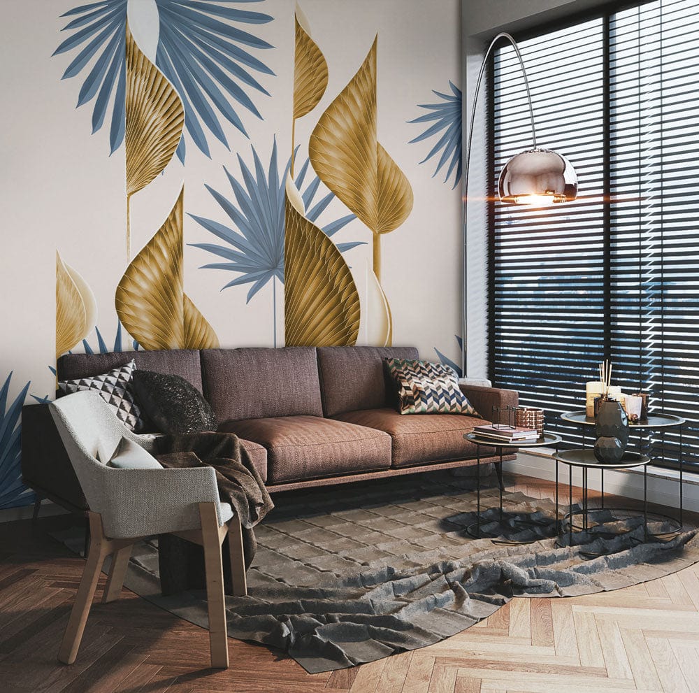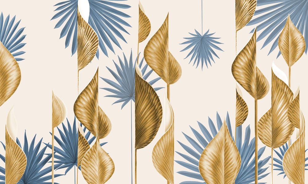 The Beige Metal Leaves Wallpaper Mural gracefully captures the essence of nature through its intricate depiction of metallic leaves. Set against a serene beige canvas, the rich golden tones of the leaves contrast beautifully with cool, muted blues, creating a sophisticated interplay of colours and textures. This mural effortlessly brings an element of refined artistry into spaces, making it an ideal feature for any contemporary or eclectic interior.