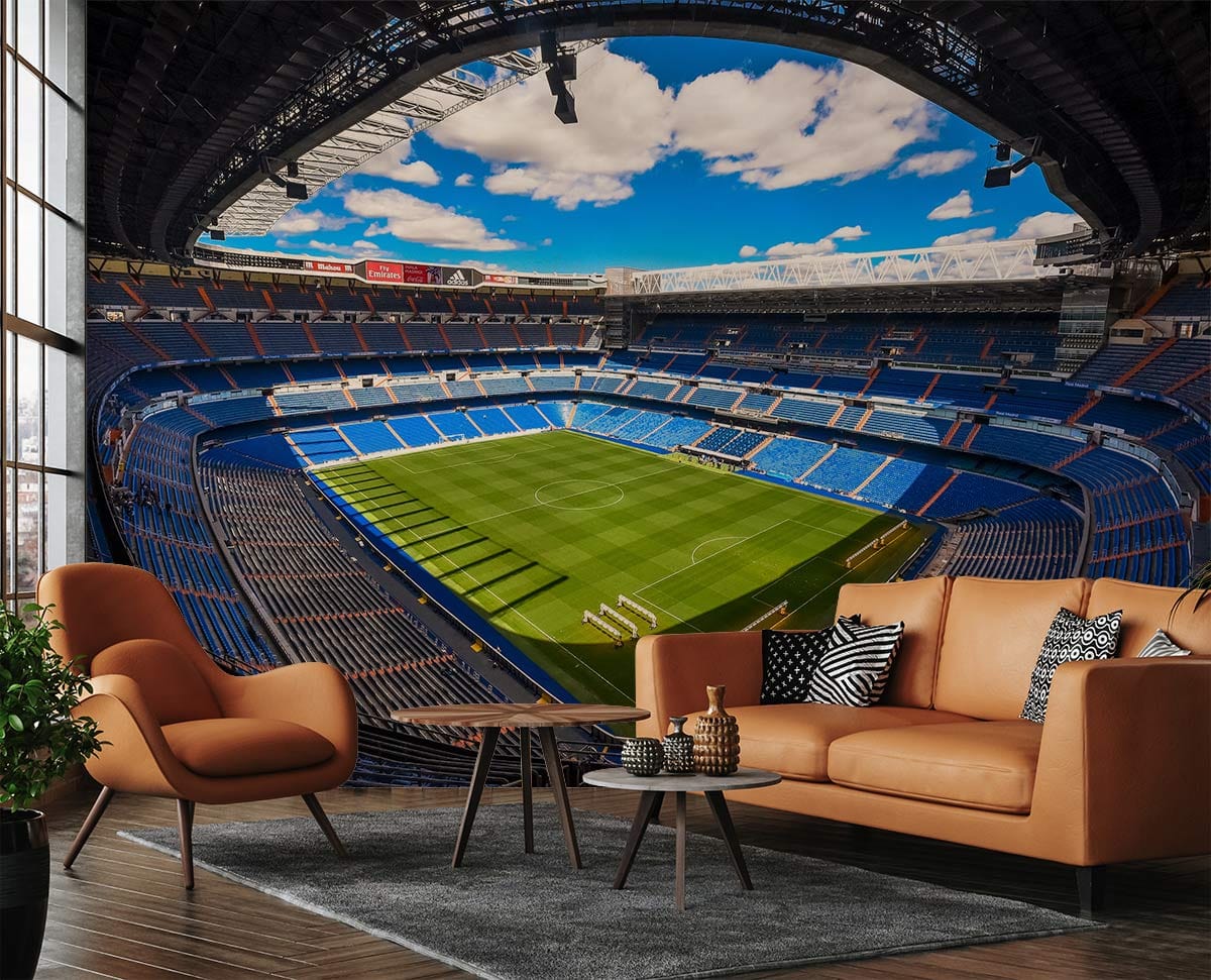 Immerse yourself in the grandeur of the Bernabeu Stadium with this captivating wallpaper mural. Its intricate design captures the dynamic interplay of light and shadow, set against a vivid azure sky. Perfect for adding a touch of sophistication and athletic allure to diverse settings, this mural brings the iconic stadium's vibrant atmosphere into your space.