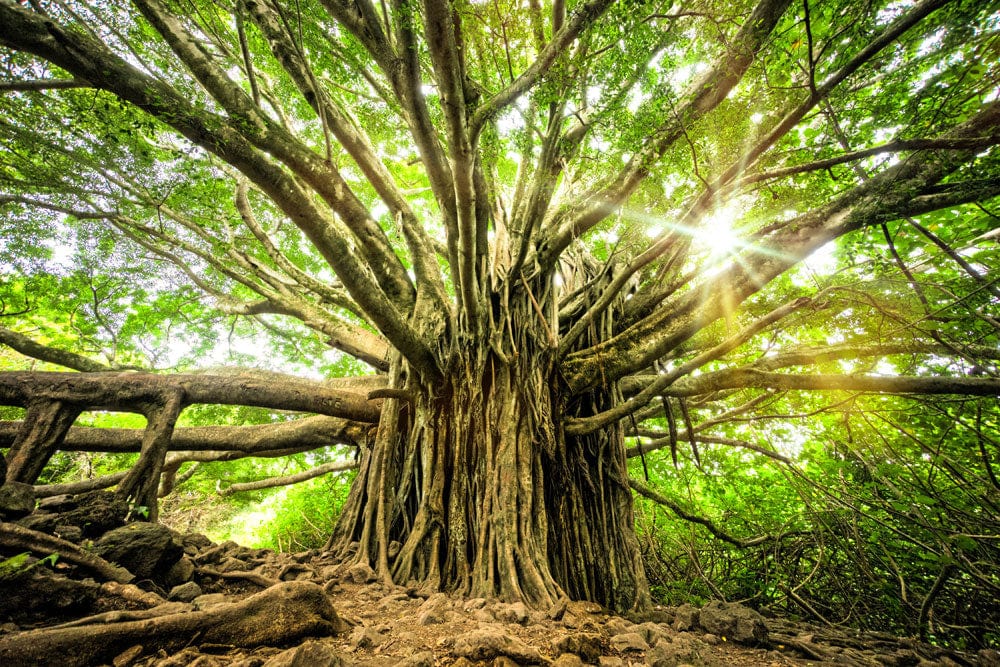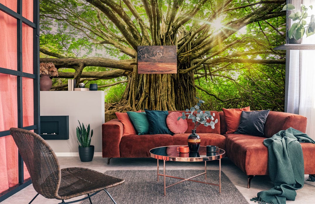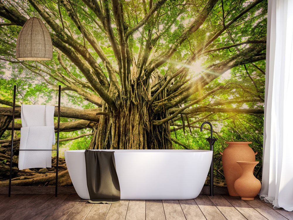 Immerse yourself in the majesty of ancient nature with this stunning wallpaper mural, depicting a grand tree bathed in sunlight. Its intricate bark textures and sprawling branches evoke a sense of timeless beauty, perfectly suited to add depth and sophistication to any interior space. The interplay of light and shadow brings a dynamic, almost ethereal quality to your surroundings, creating an atmosphere of tranquillity and reverence.