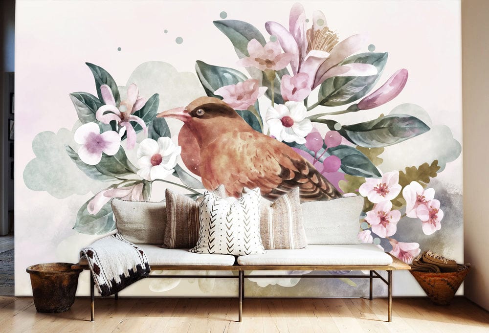 Enjoy the naturalistic beauty of our Bird in Flower Wallpaper Mural. This mural features a brown bird perched on the middle of purple and white flowers, creating an understated yet charming look for your walls. This design is ideal for brightening up your living room, bedroom, or any other space in your home while flaunting an interesting vintage, hand-painted look that is great for floral-themed interiors and delicate glass furnishings.