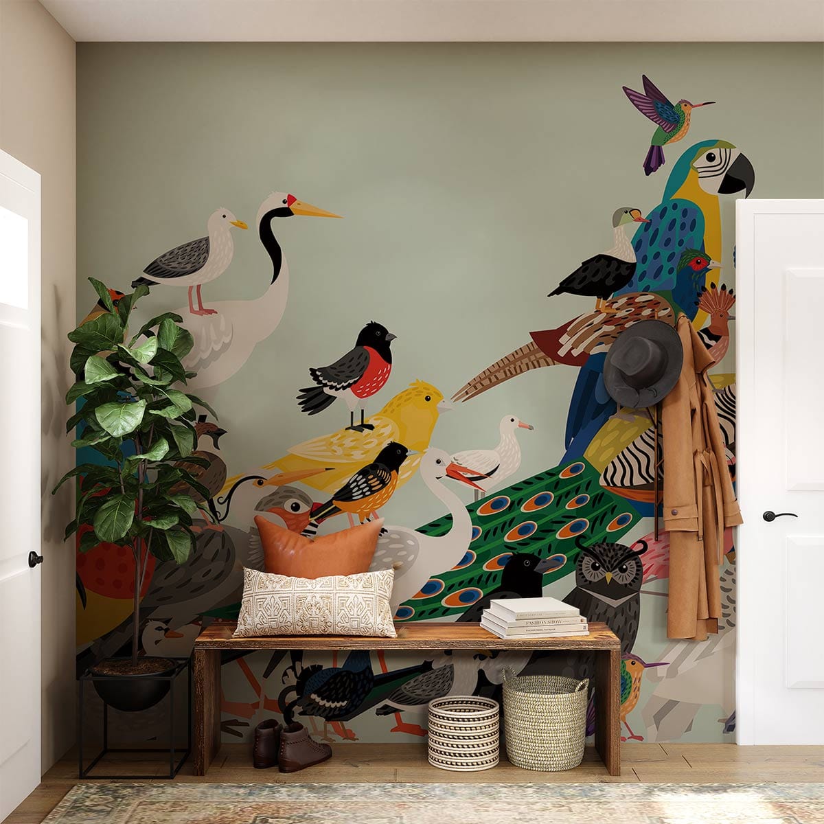 The Birds Gathering Wallpaper Mural is a captivating array of avian artistry, where vibrant hues and intricate details depict an enchanting assembly of birds. Each creature, rendered with precision, adds a lively yet sophisticated touch to any space. The mural's diverse palette and elegant design evoke a timeless charm, seamlessly fitting into both modern and classic interiors.