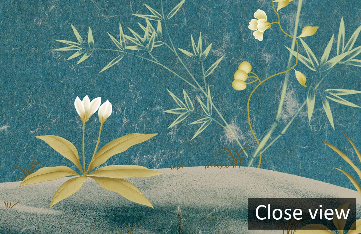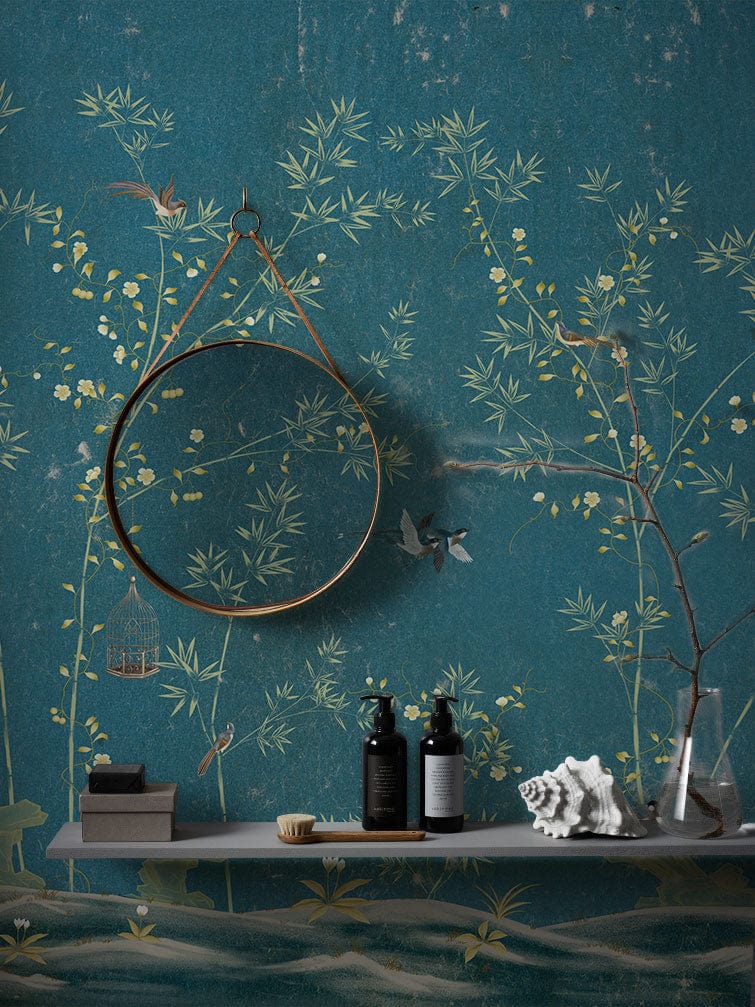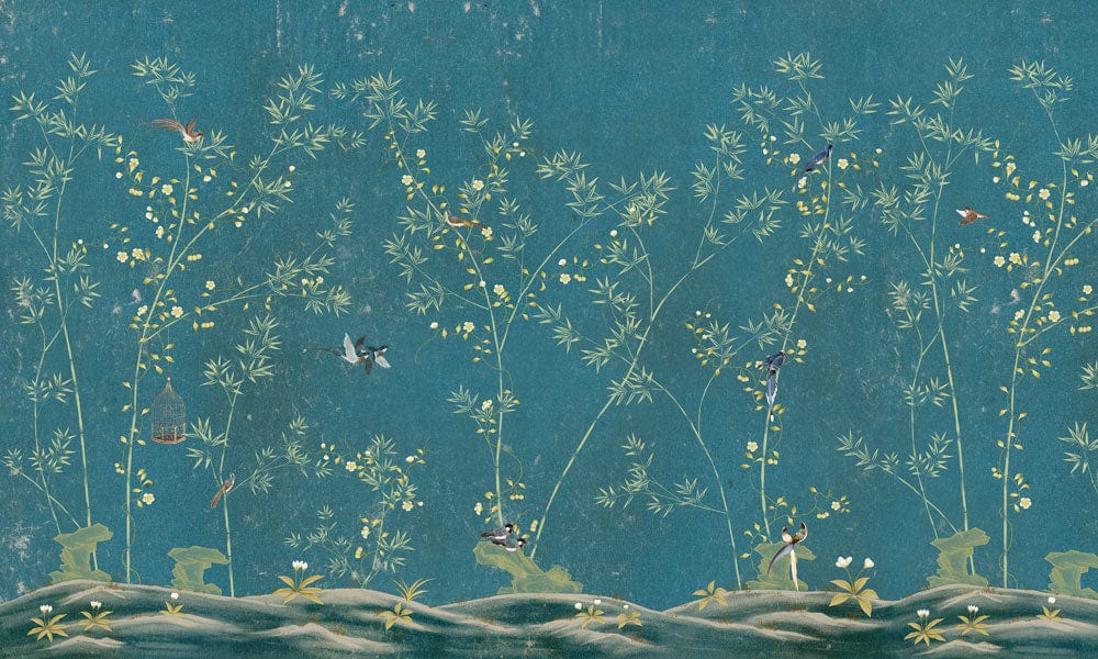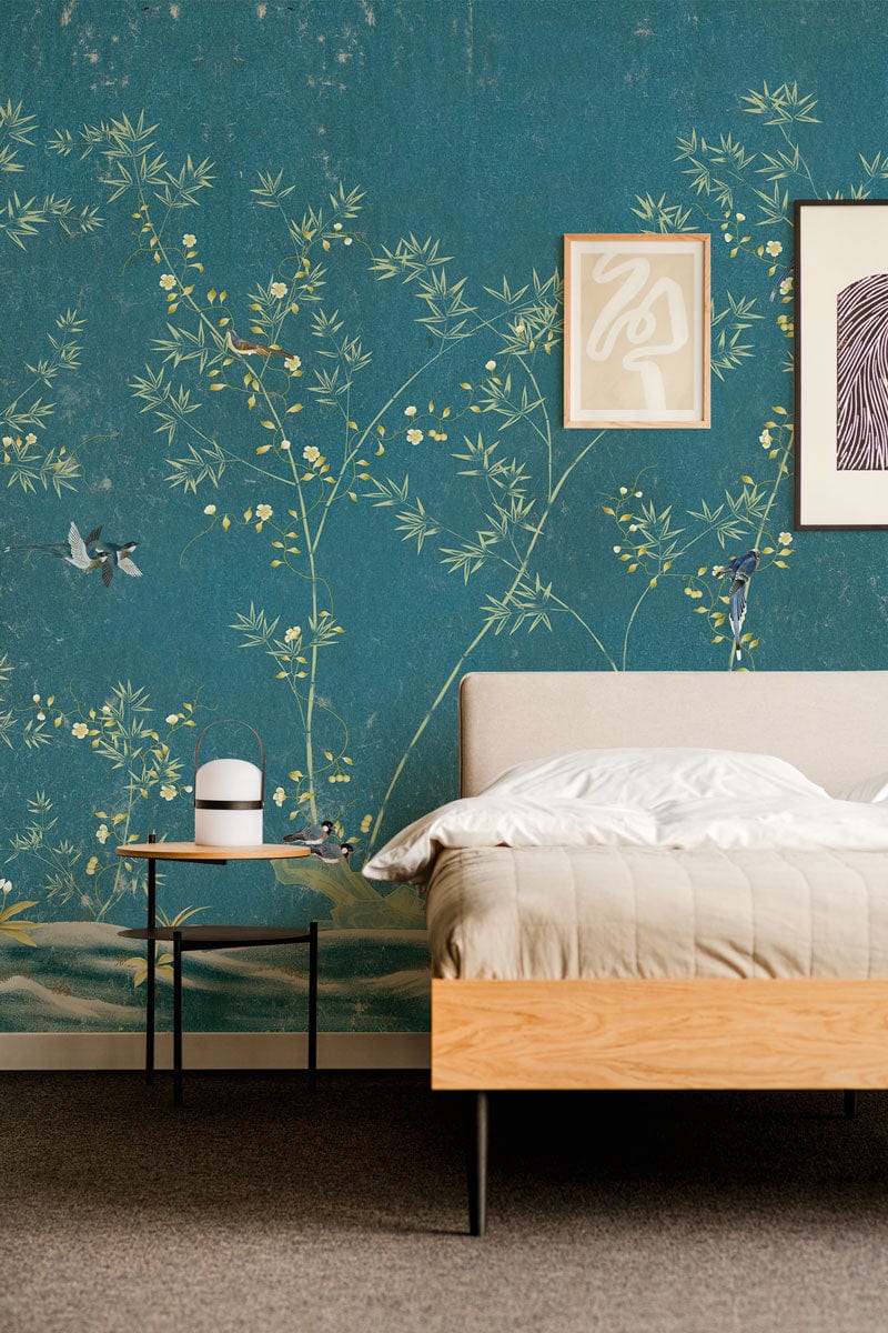 Immerse your interiors in the enchanting aura of the Birds Habitats Wallpaper Mural. This exquisite design showcases delicate avian figures amidst softly flowing foliage, set against a serene teal background. The mural's intricate artistry and refined colour palette create an elegantly timeless atmosphere, effortlessly complementing classic and contemporary settings.