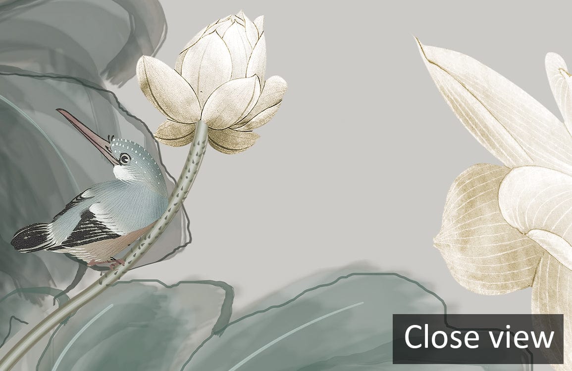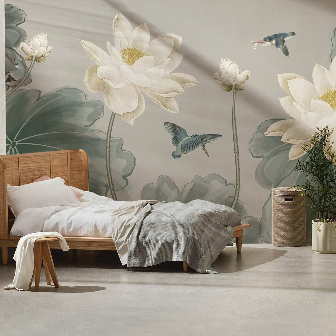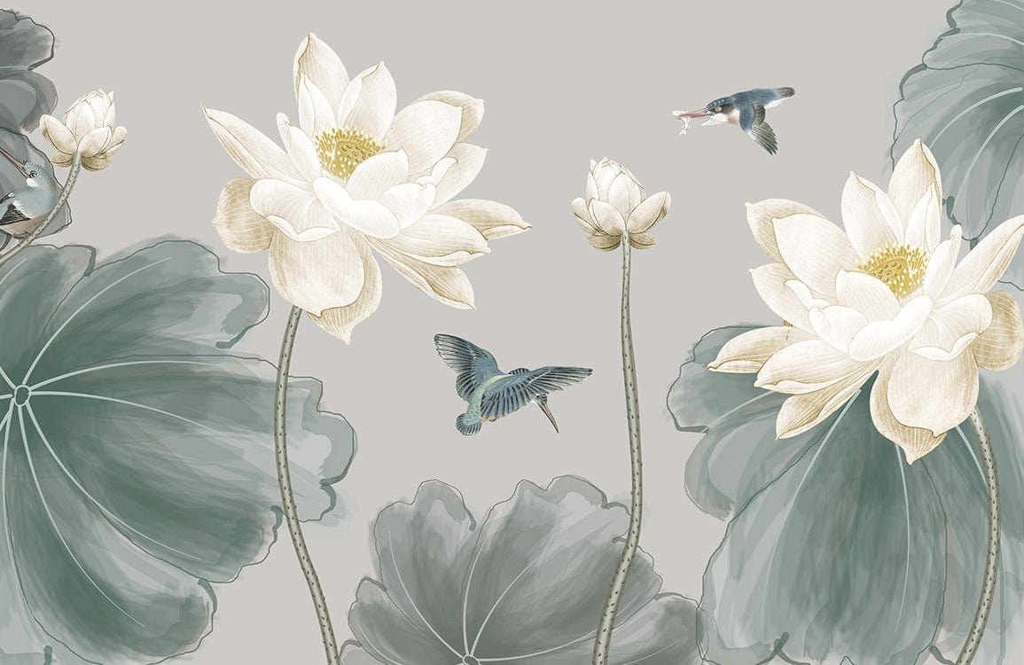 Immerse your space in a serene tableau with the Birds & Lotus Wallpaper Mural, where graceful birds flit among elegant, blossoming lotuses. This artwork features delicate brushstrokes and a calming palette, embodying both tranquillity and sophistication. Its timeless design effortlessly complements diverse interiors, offering an ideal backdrop for refined living areas or tranquil bedrooms.
