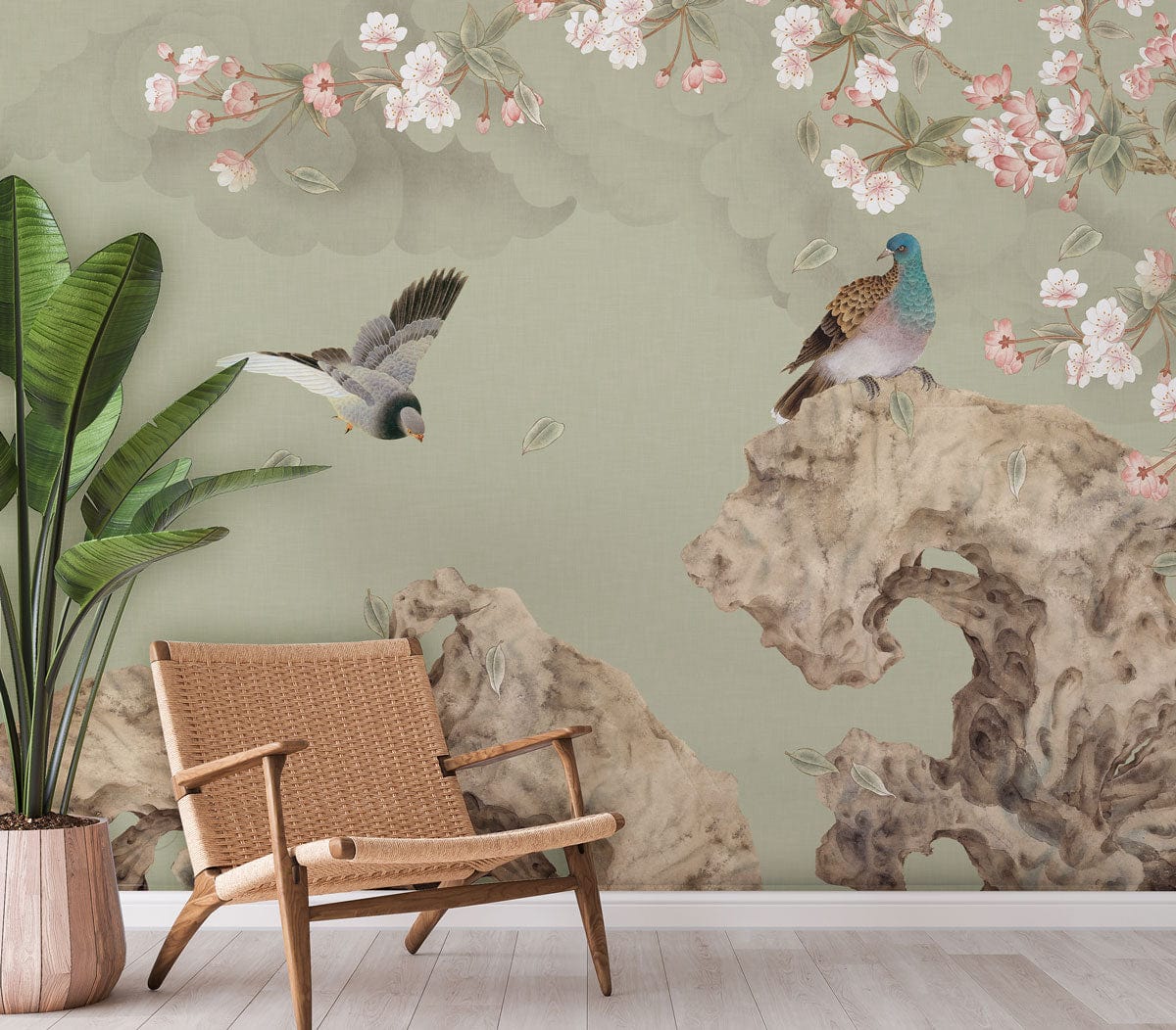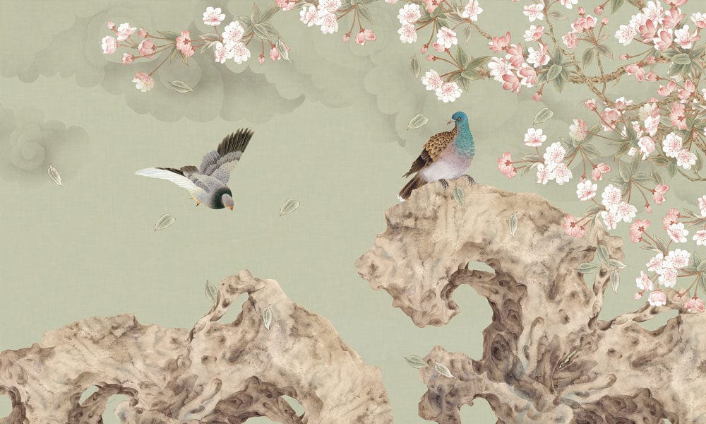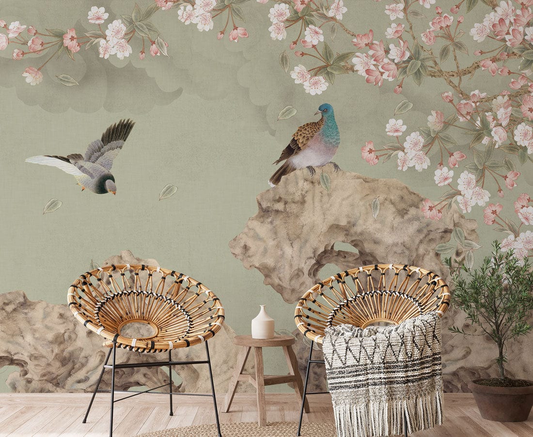 Immerse your space in the serene beauty of the Birds Talking Wallpaper Mural. This exquisite design showcases delicate birds perched amidst blossoming cherry branches, set against a soft green backdrop. The intricate artistry of each feather and petal invites a sense of tranquillity and elegance, seamlessly fitting into settings from a classic library to a tranquil bedroom.