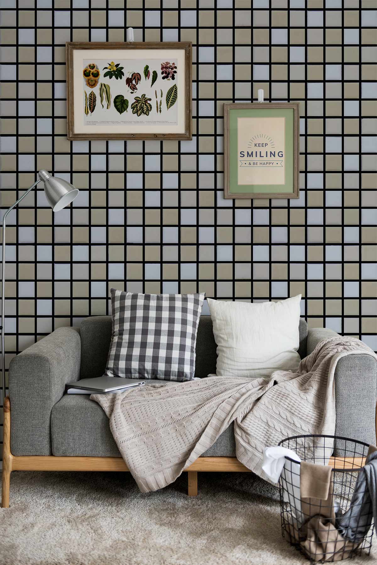 Experience the exquisite allure of the Black & Blue Mosaic Wallpaper Mural, featuring an intricate grid pattern that draws the eye with its elegant geometry. The mosaic's balance of navy and charcoal greys creates a captivating tapestry of colour and texture, reflecting a unique blend of modern artistry with a timeless touch. This sophisticated piece effortlessly complements a range of interiors, adding depth and character to each space it graces.