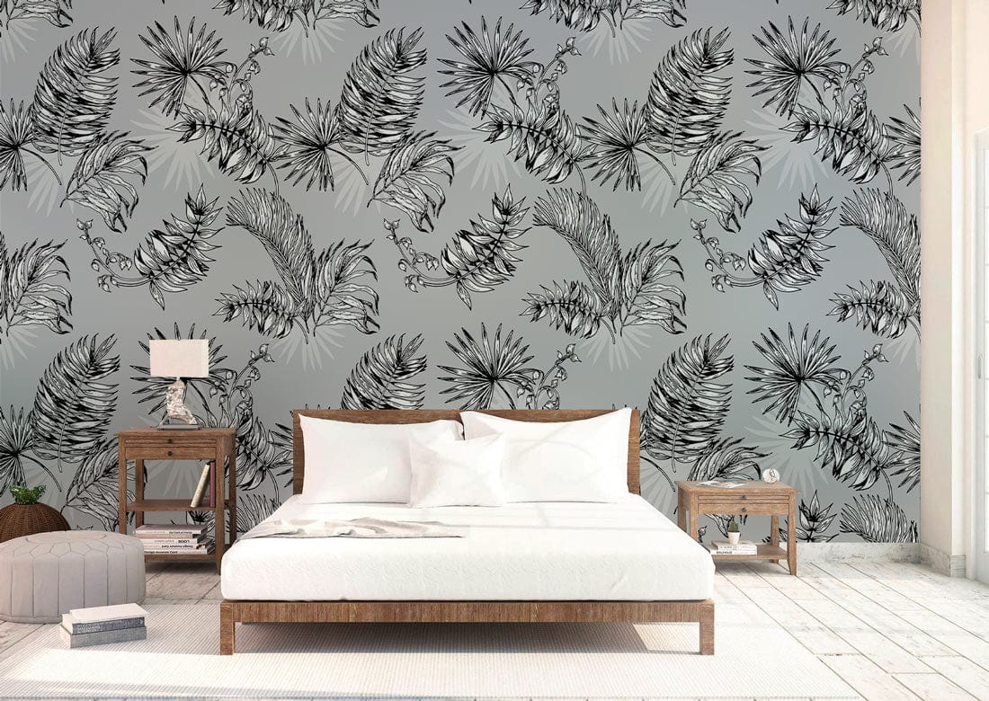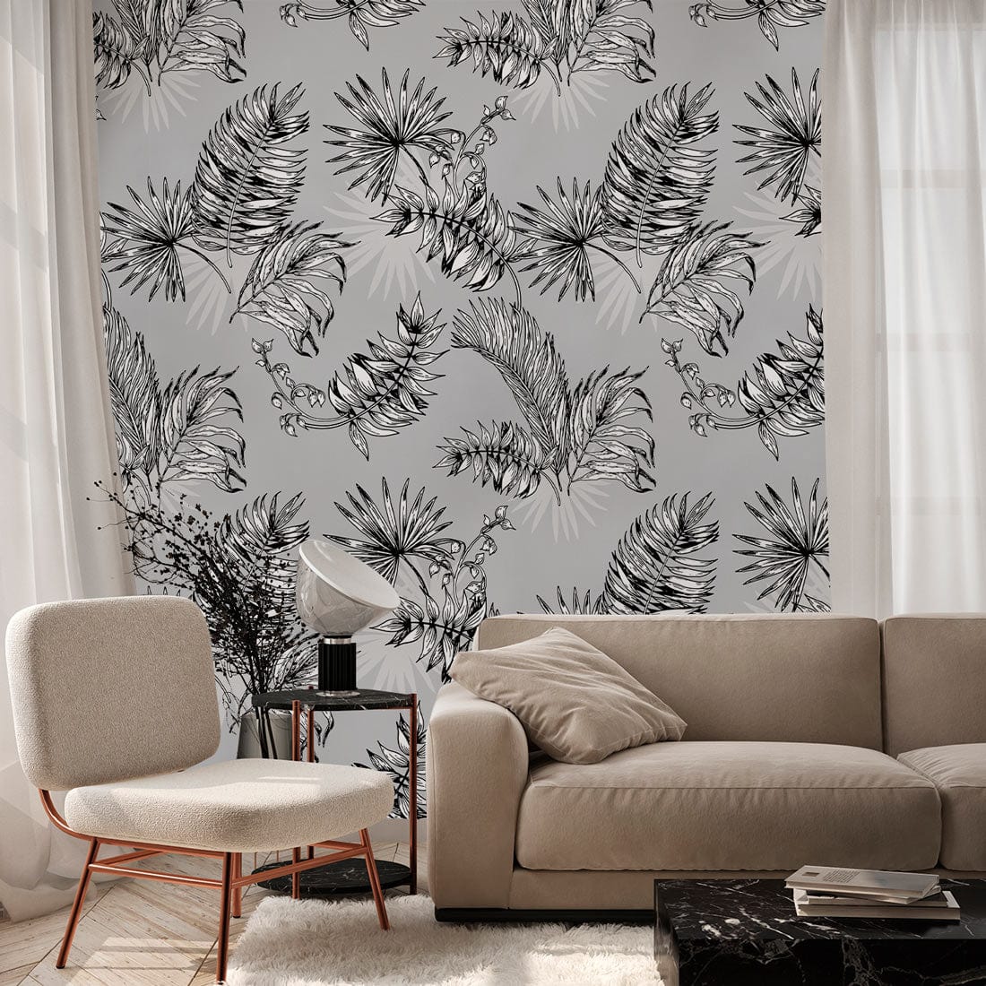 Immerse yourself in the refined elegance of the Black Leaves on Grey Wallpaper Mural. Delicately illustrated black foliage silhouettes dance across a soft grey backdrop, creating a graceful interplay of light and shadow. This design brings a sense of natural tranquillity and artistic flair to any interior. Its timeless sophistication suits a variety of settings, effortlessly complementing both modern and classic décor.