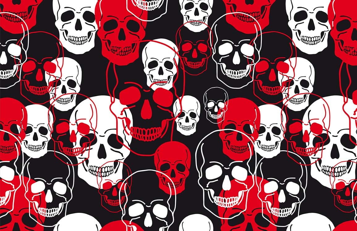 Immerse your space in the bold elegance of the Skeleton Head III Wallpaper Mural. This captivating design weaves intricate skull motifs in striking red, black, and white, evoking a sense of enigmatic charm. The precise alignment and vivid contrast create an artistic focal point, transforming walls into canvases of classic sophistication. Perfect for infusing character into any interior, this mural seamlessly complements both modern and eclectic decor, offering a timeless yet contemporary allure.