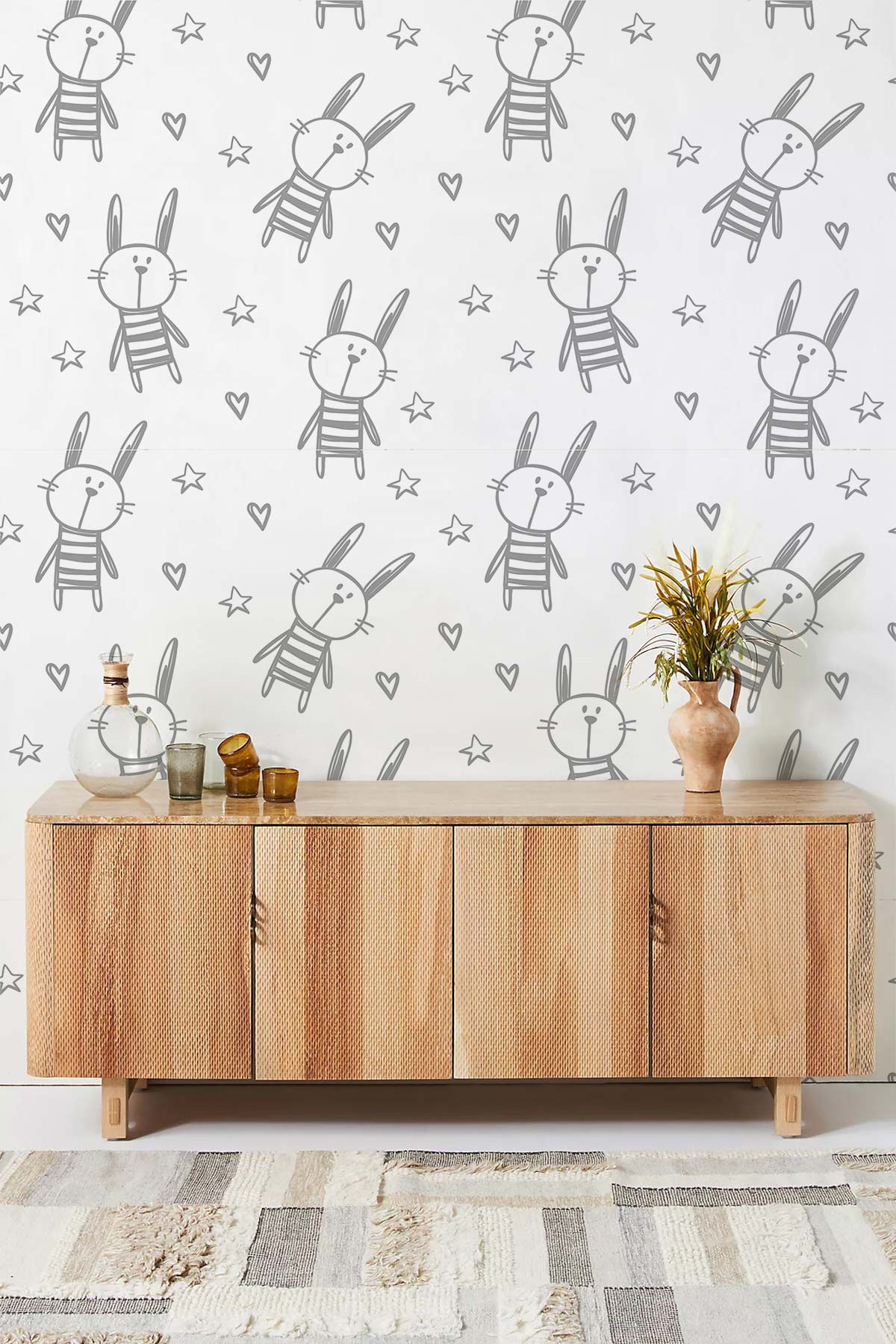 Decorate your kids鈥?room with a very neutral simple mural wallpaper that works for both boys and girls and let them love their room and feel so relaxing and attached to their beloved small area. The grey at the background and the shades of the dark grey in the bunny patterns will give you free range to choose of different palettes while decorating the room with this mural. You can style it for both teenagers and also kids and it will look so cute with off-white bed and fluffy carpets and chiffon curtains.
