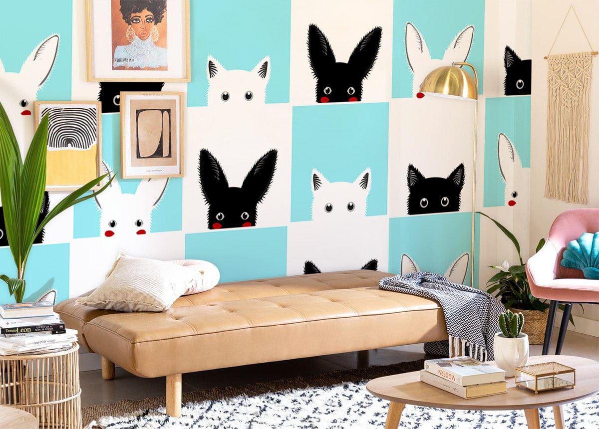 Introduce a captivating charm to your interiors with this Black & White Cat Wallpaper Mural. Featuring a playful pattern of cat faces interspersed with striking monochrome tones and gentle touches of aqua blue, this design offers a perfect blend of whimsy and sophistication. The minimalist artwork, highlighted by subtle red accents on the cats' features, creates a delightful visual rhythm that easily complements both modern and eclectic settings. A tasteful choice for adorning a child's room or adding a touch of unpretentious elegance to a study or lounge.