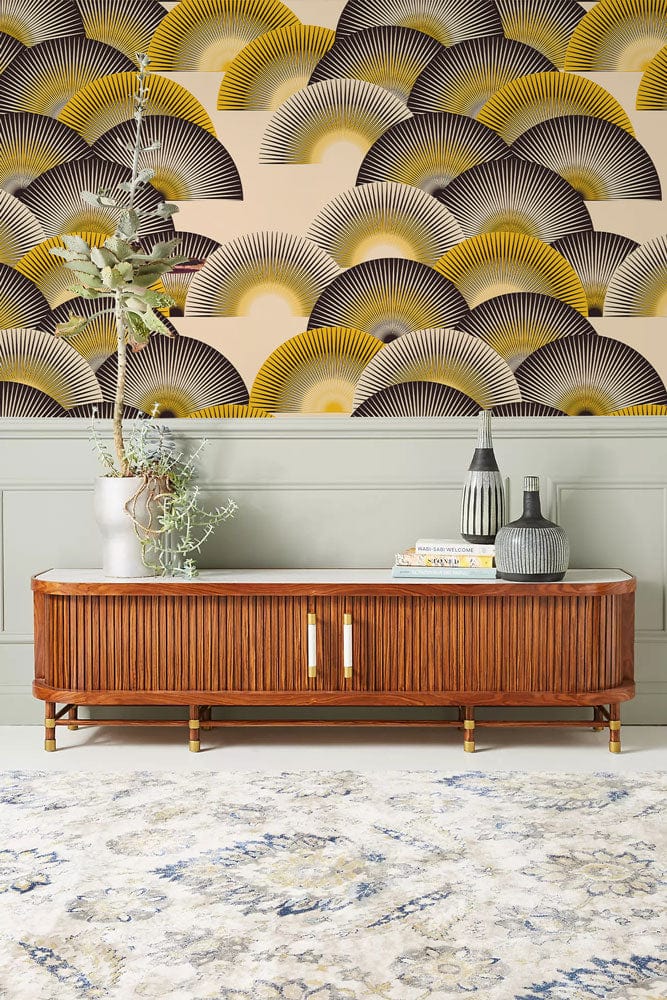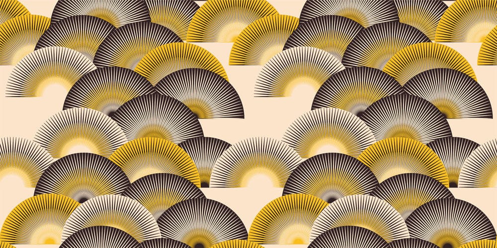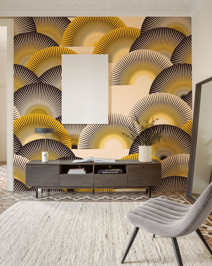 This Black & Yellow Fans Wallpaper Mural showcases a sophisticated interplay of geometric fans, weaving a pattern of elegance and intrigue. The precise lines and contrasting hues bring a sense of depth and movement, making it an exquisite choice for both modern and classic interiors. The delicate balance of the rich black and sunny yellow adds a touch of warmth and refinement, creating a striking focal point in any room.