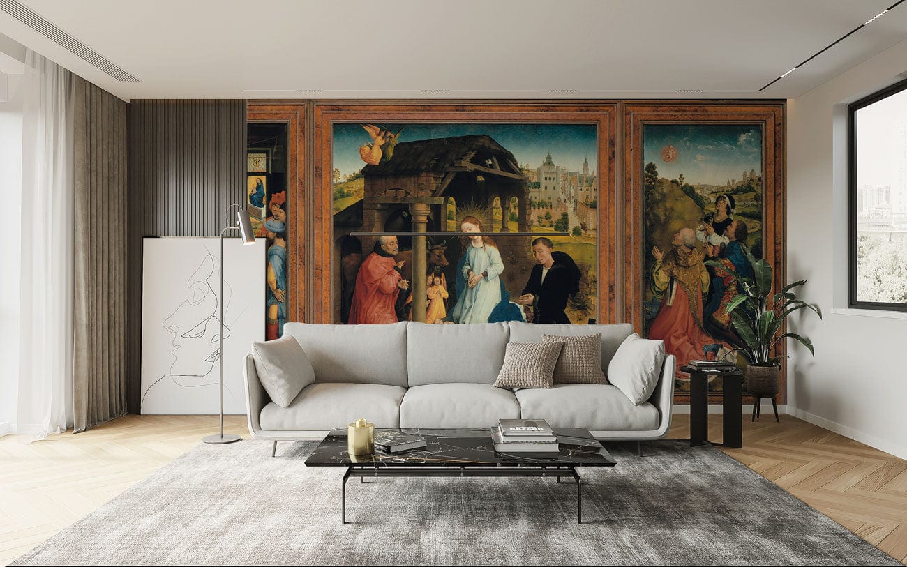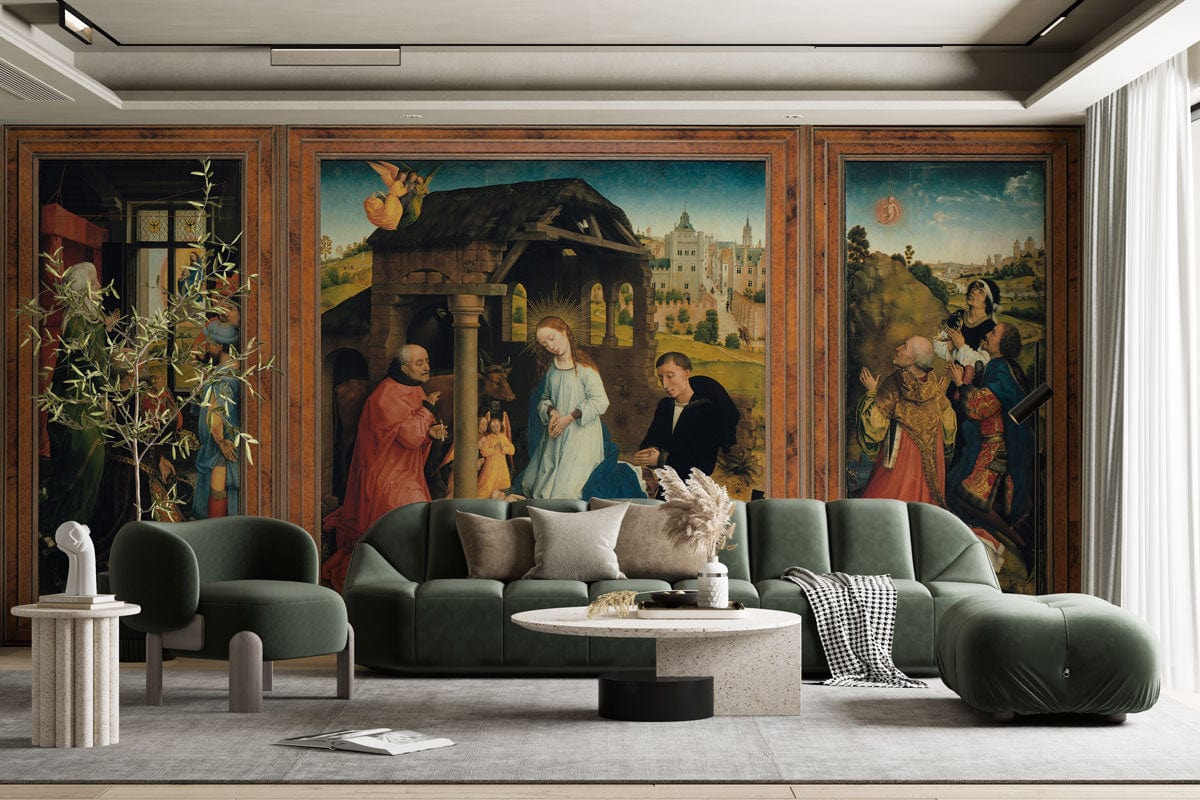 The Bladelin Altarpiece Wallpaper Mural captures the essence of Renaissance artistry with its intricate and rich depiction of historical and religious scenes. This mural showcases an exquisite blend of storytelling and artistry, presenting detailed figures adorned in vibrant garments set against a backdrop of architectural and pastoral elegance. Its textured finish imparts a sense of depth, inviting viewers to experience the timeless beauty and sophistication of classical art in any space.