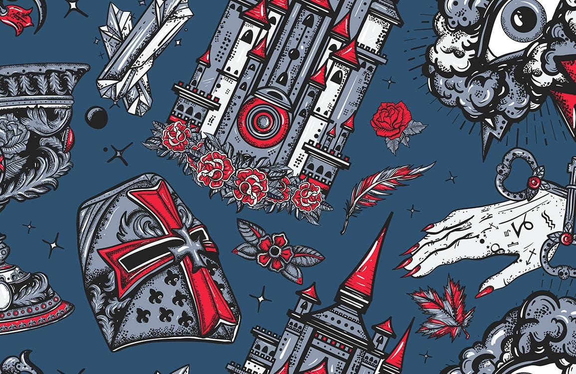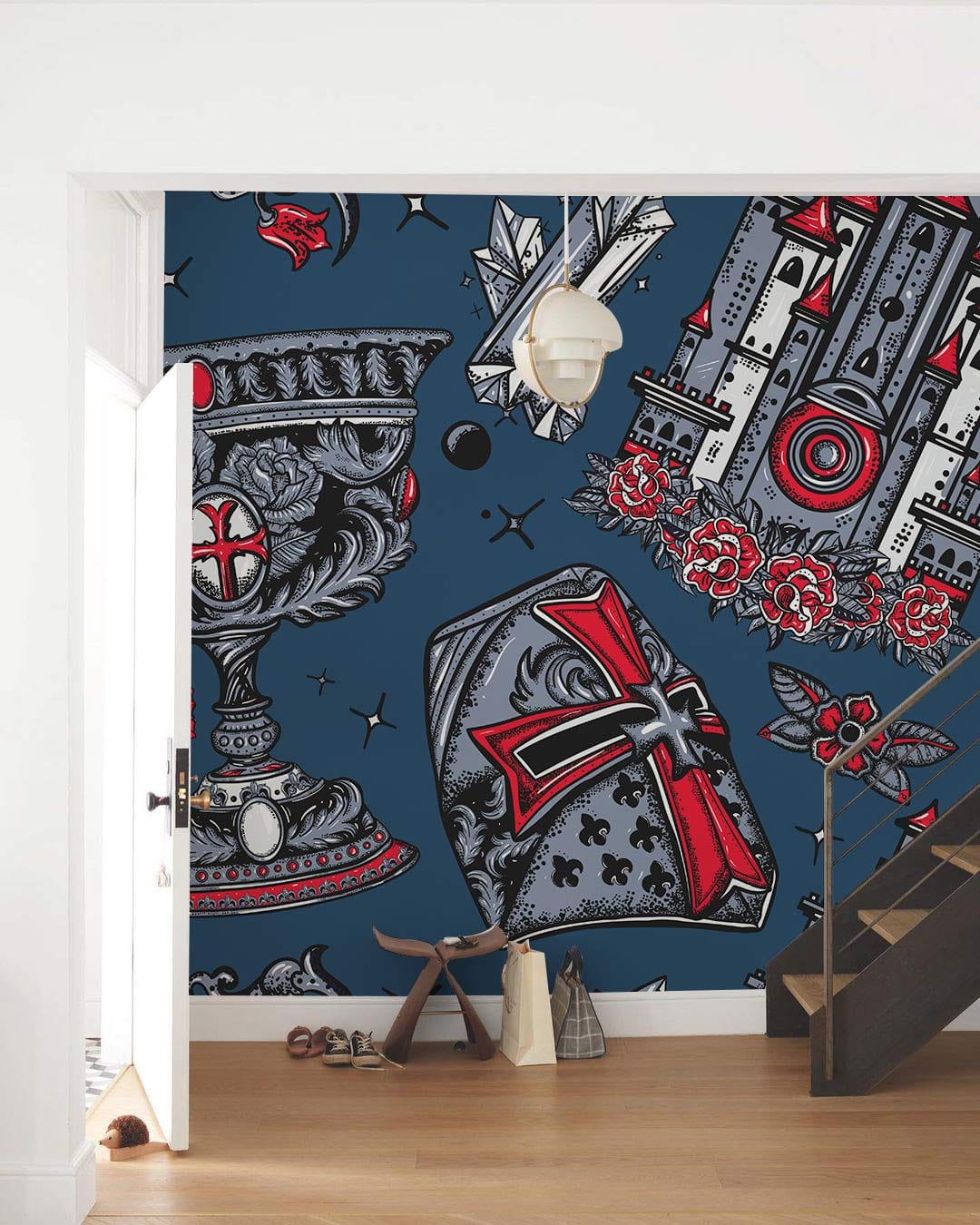 If you are looking for a wallpaper mural with Gothic style, this design will be a good choice for you. Atop the dark-blue colour background, there are many amazing Gothic patterns. Castles, shields ,eyes and hands, you should not miss it if you like Gothic styles. This wallpaper mural can be installed in your bedroom and home office and hallway. Choose this design and be a cool guy.