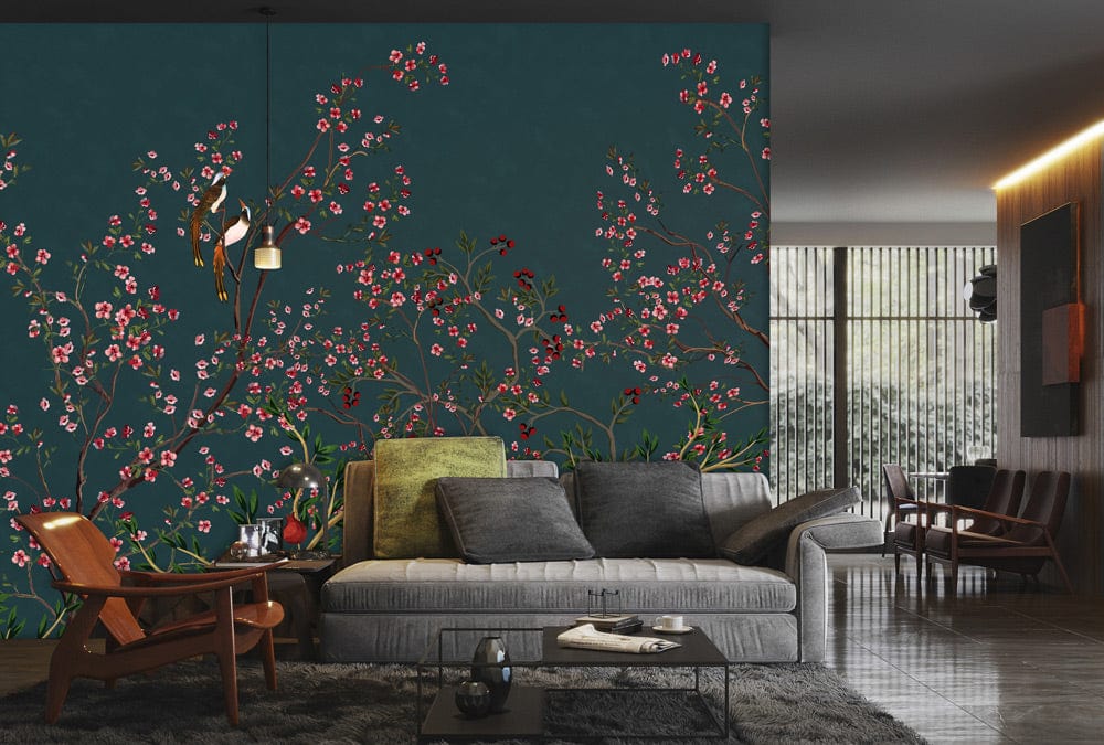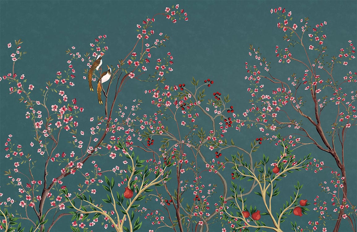 Bloomy Pomegranate Tree ll Wallpaper Mural showcases a captivating blend of nature-inspired artistry, featuring delicate pomegranate trees intertwined with vibrant branches. This striking design, set against a deep, serene backdrop, imbues any space with a sense of refined elegance and timeless beauty. The mural's intricate patterns and rich textures make it a sophisticated choice for diverse interiors.