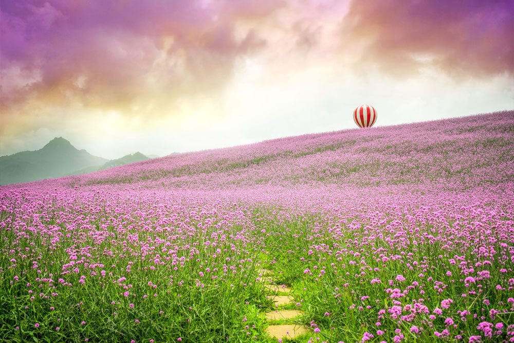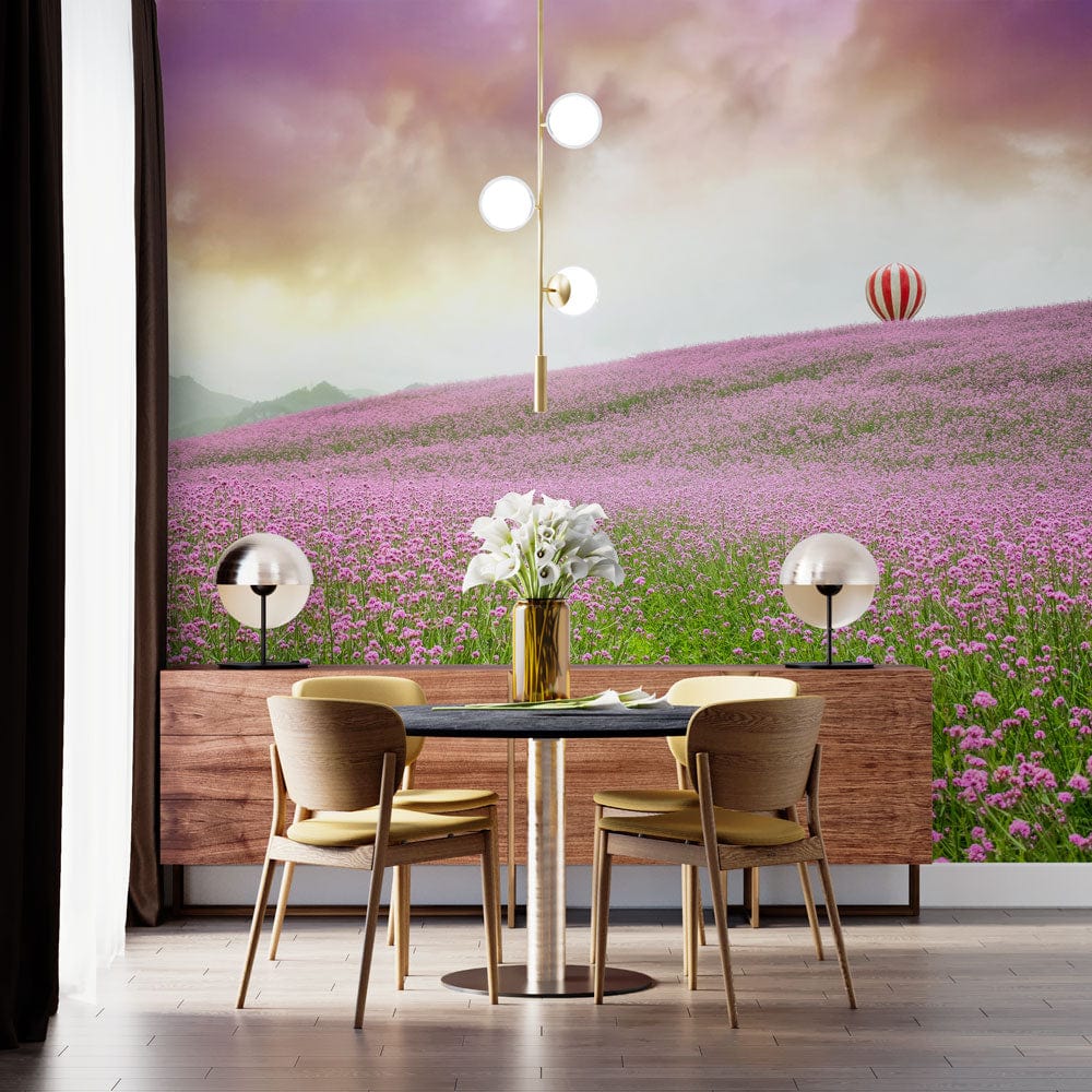 Immerse your space in the dreamy expanse of the Blossomy World Wallpaper Mural, where a lush field of lavender blooms stretches towards a vibrant sky. The whimsical hot air balloon adds a touch of wonder, while the distant mountains create depth and a sense of tranquillity. This mural brings a serene elegance to interiors, seamlessly fitting modern and rustic aesthetics alike.