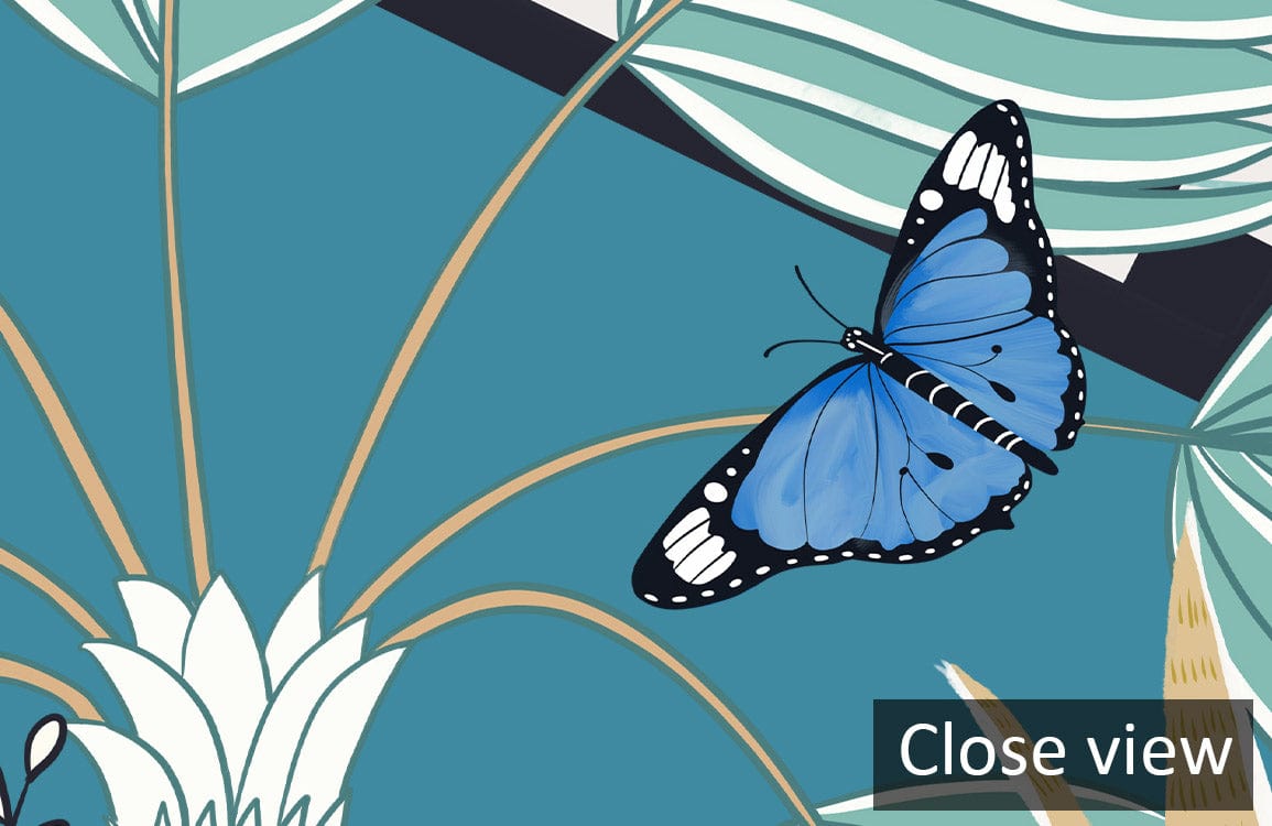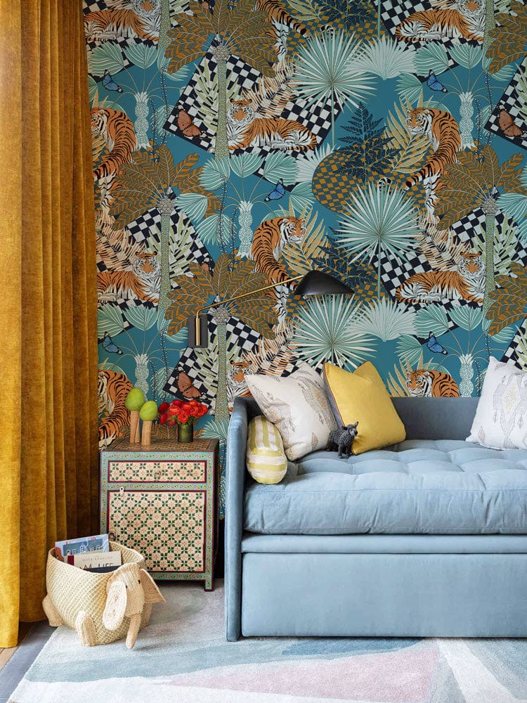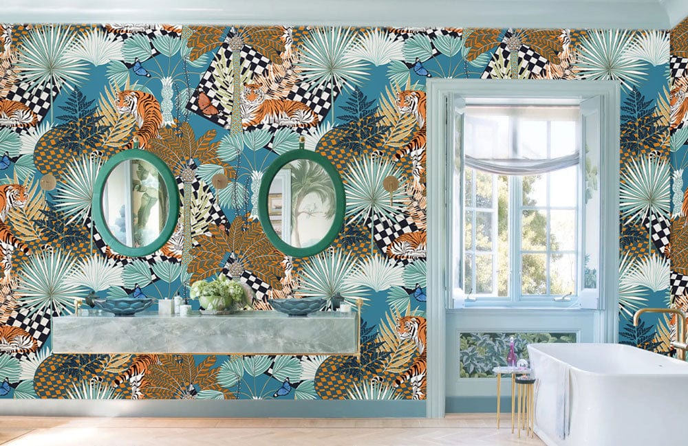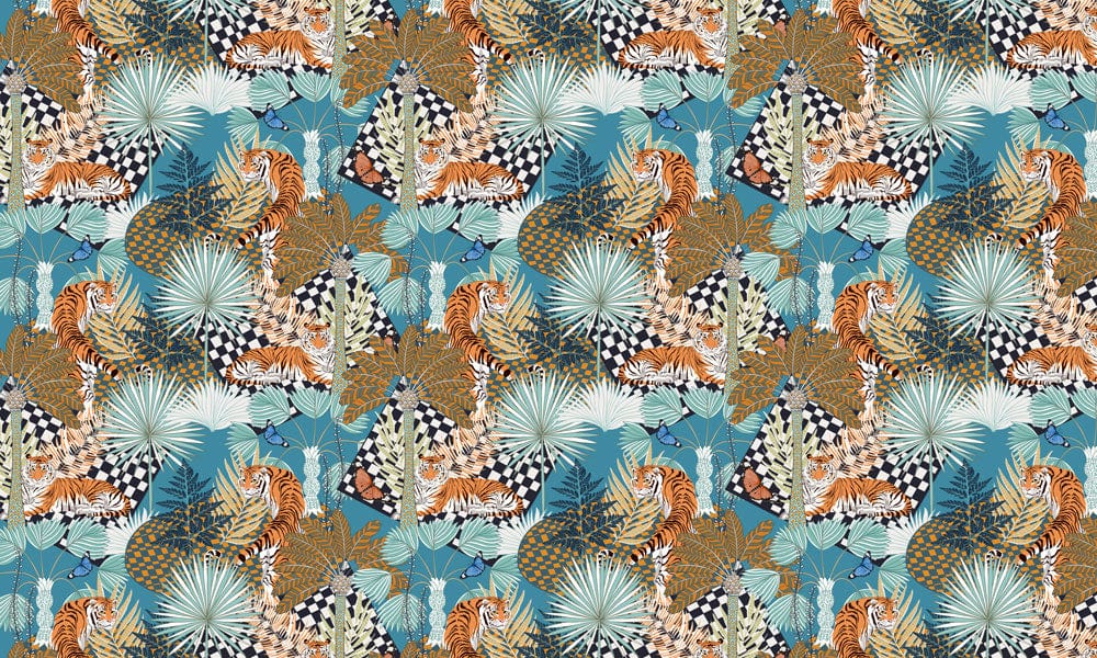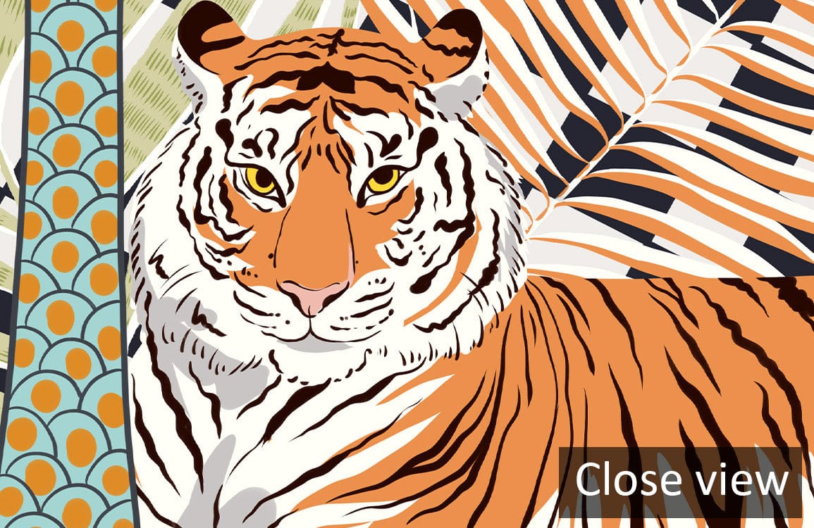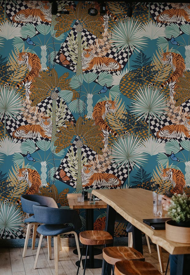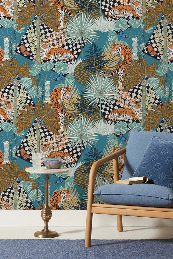 Immerse your space in the captivating allure of a mystical jungle with the Blue Abstract Tiger Jungle Wallpaper Mural. This exquisite design features majestic tigers gracefully intertwined with lush foliage and geometric patterns, creating a harmonious blend of nature and abstract art. The intricate detailing and dynamic composition lend a depth and texture that complements both classic and contemporary interiors. Perfect for adding a touch of wild elegance and sophistication to any room.