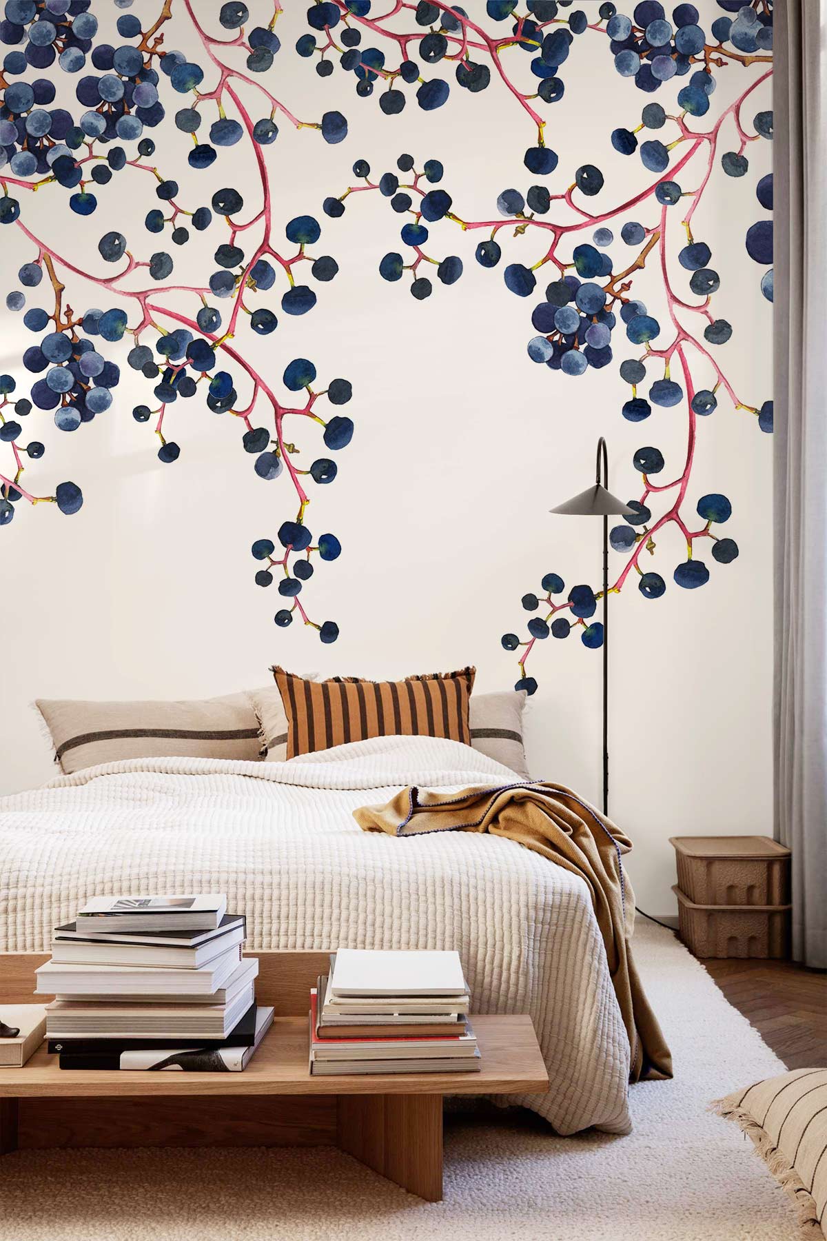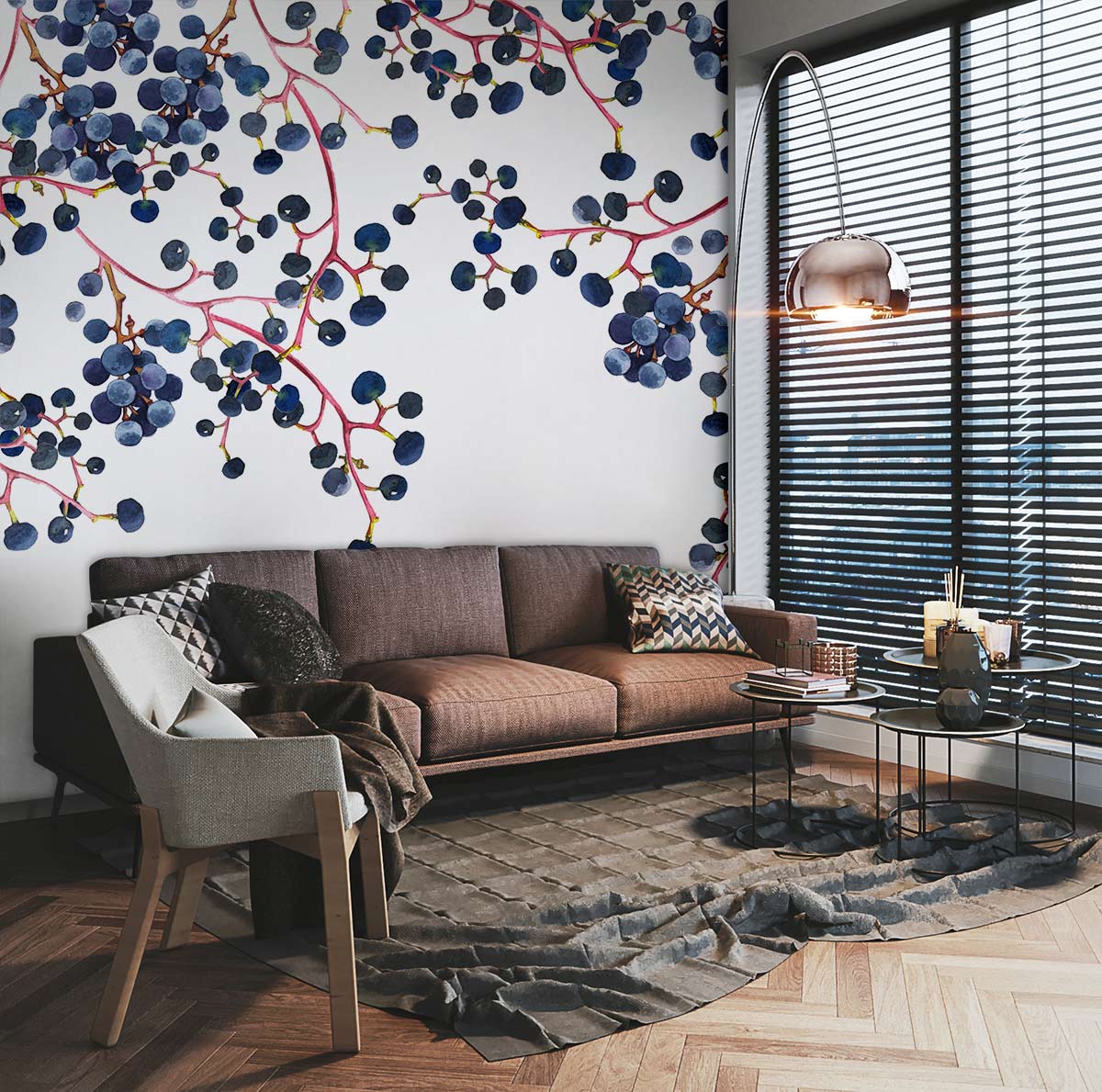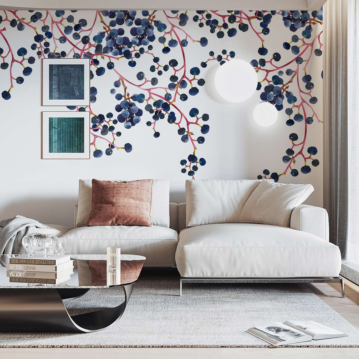 Embrace the artistry of nature with the Blue Berry Vines Wallpaper Mural, where delicate vines cascade gracefully across your walls adorned with clusters of deep blue berries. The intricate design, paired with soft watercolour hues, exudes a timeless elegance, effortlessly complementing both modern and classic interiors. Perfect for creating a serene yet sophisticated ambience, this mural serves as a captivating backdrop for any room, inviting a sense of tranquillity and refined taste.
