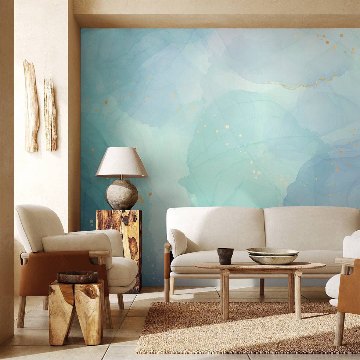 This Blue & Green Watercolour Wallpaper Mural elegantly captures the fluidity of artistic brushstrokes, with soft washes of aquamarine and jade interwoven with delicate gold accents. Its soothing palette and abstract design evoke a sense of tranquillity and sophistication, perfectly complementing both modern and classic interiors. Ideal for creating a serene oasis in any room, this mural brings a touch of artistic luxury to your space.