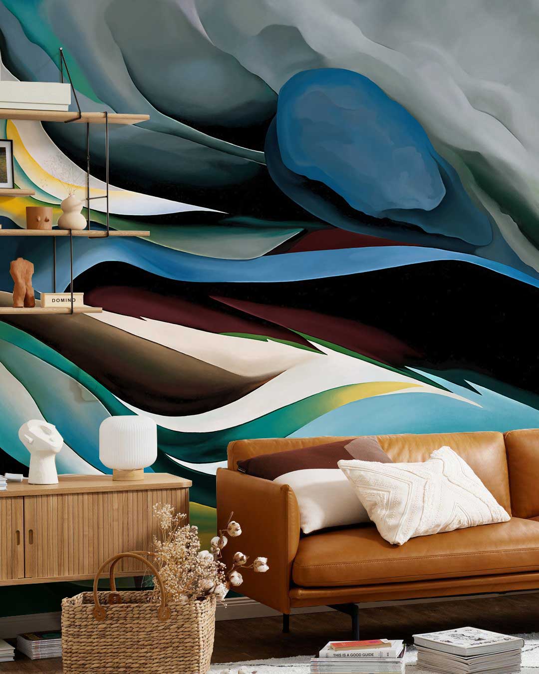 Immerse your space in a captivating blend of swirling blues, greens, and earth tones with the Lake Art Wallpaper Mural. Its dynamic, flowing design suggests the serene movement of water and waves, creating an atmosphere of elegance and tranquillity. This mural effortlessly complements a variety of interior styles, offering a sense of depth and artistic flair to any space.