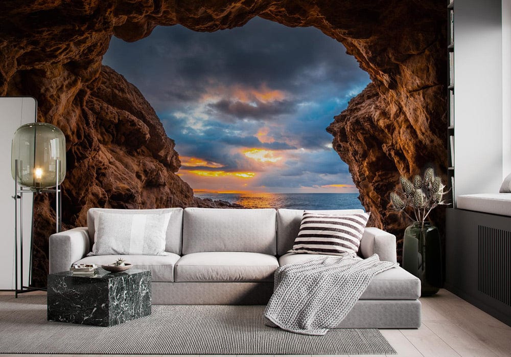 Immerse yourself in the captivating beauty of nature with the Ocean from Cave Wallpaper Mural. This stunning piece captures a serene vista where rugged cave textures meet the tranquil ocean, under a dramatic sky painted in hues of sunset. Its intricate details and vibrant scenery bring a sense of luxury and sophistication, making it an exquisite choice for any room seeking a timeless and artistic ambience.