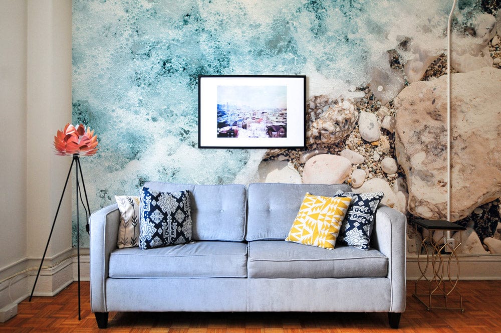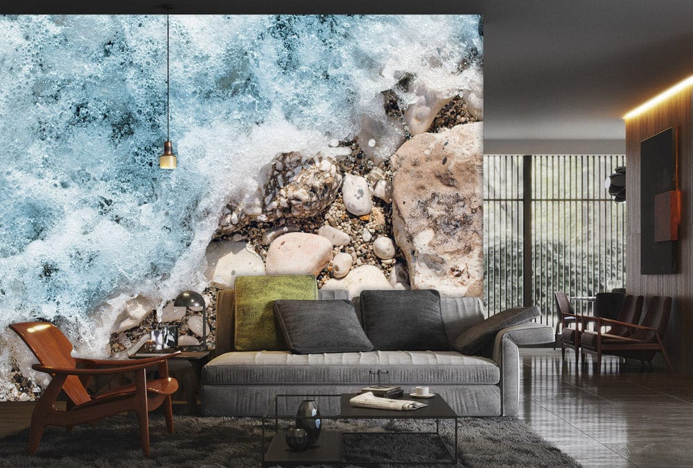 Get ocean-loving vibes in any room with this Waves Crashing Stones Wallpaper Mural. Featuring classic waves crashing against ocean stones, this wallpaper mural will add an artistic touch to any space while still complementing your decor. Displaying blues and greens that are reminiscent of the ocean, this coastal-style wallpaper mural conveys the tranquility of the sea to your walls and will add a calming effect to your home or commercial space.