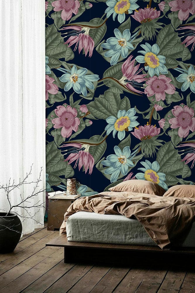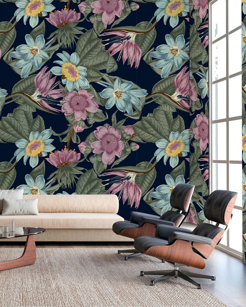 Immerse your space in the enchanting allure of the Blue & Purple Daisies Wallpaper Mural, where lush floral motifs cascade gracefully against a deep, mysterious backdrop. Each petal is rendered with artistic precision, reflecting a harmonious blend of vivid hues and intricate leaf patterns. This mural brings an artistic flourish to your walls, elegantly fitting both vintage and contemporary interiors with its timeless charm.