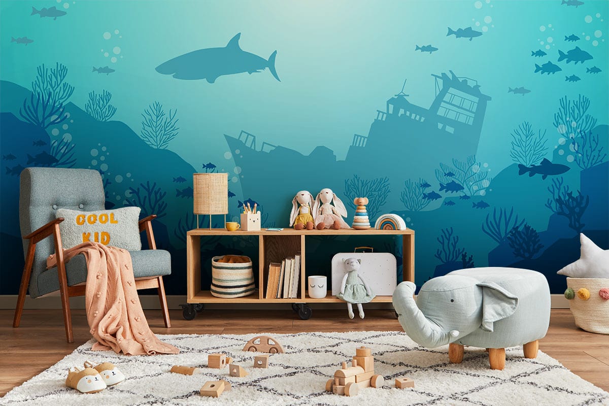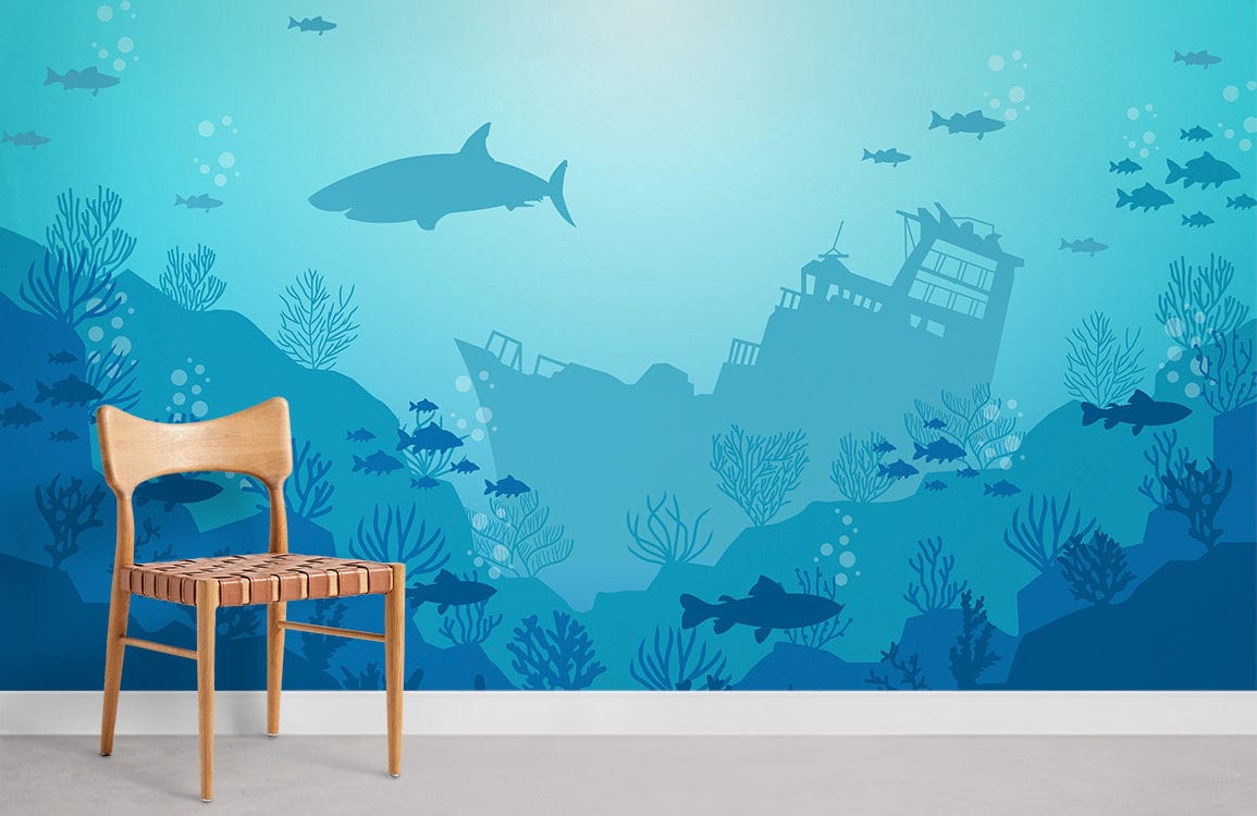 Immerse yourself in the serene depths of the ocean with the Underwater World Wallpaper Mural. Featuring intricate silhouettes of marine life and a mysterious shipwreck, this design captures the essence of underwater tranquility. The rich hues blend seamlessly to create a sophisticated and captivating ambience, perfect for adding character to any room.