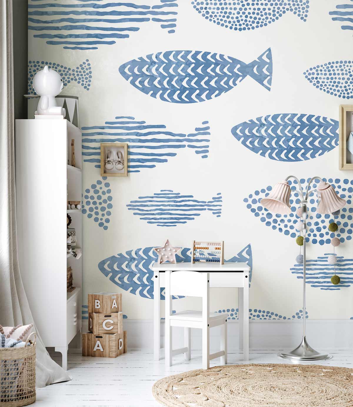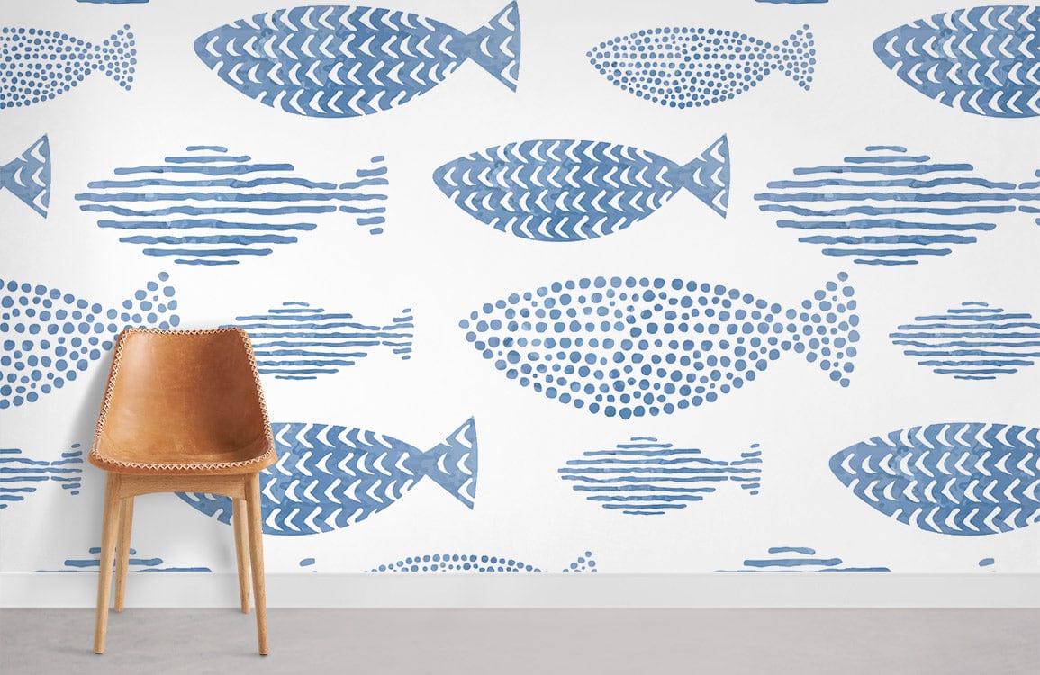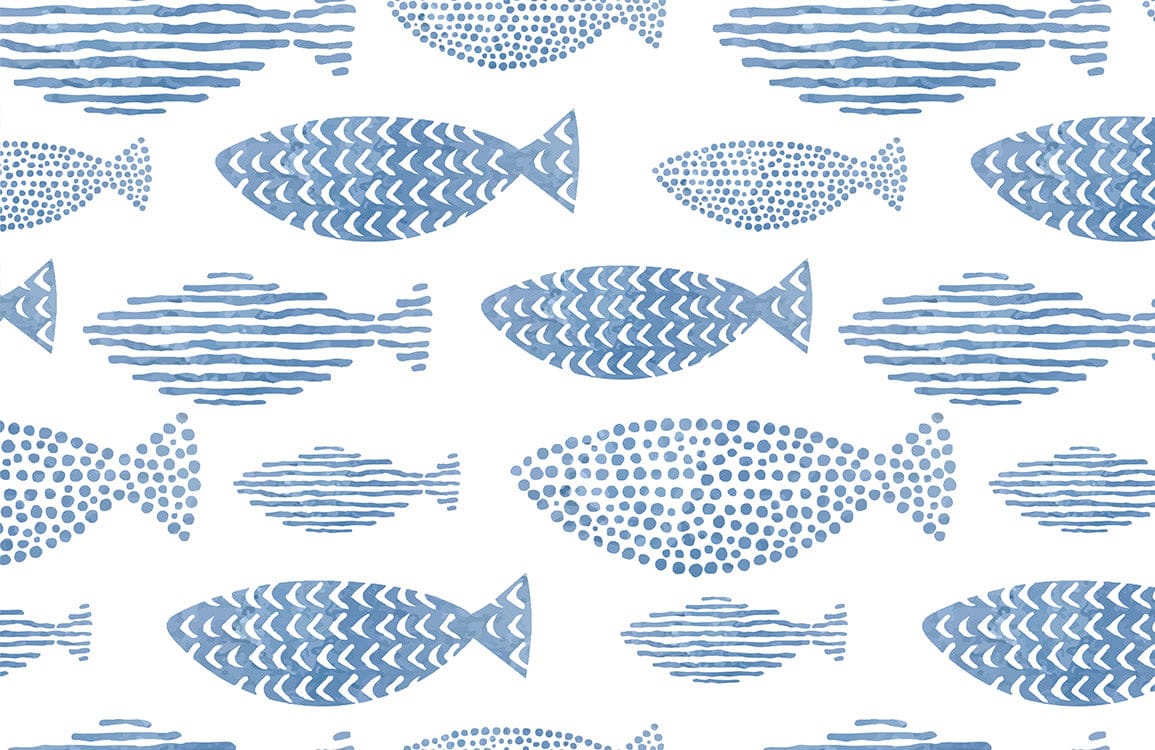 Playful hand-drawn fish swim across a crisp white background in soft blue tones. The repeating pattern feels light, breezy, and cheerful, bringing a subtle seaside charm that adds character without overwhelming the space.