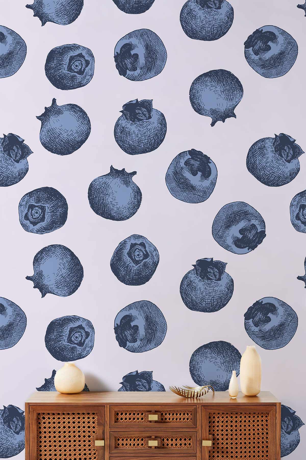 Dive into a serene haven with the Blueberries Wallpaper Mural, showcasing an intricate design of sketched berries in deep blue hues. The delicate interplay of light and shadow on a muted backdrop captures an elegant and artistic motif. Perfectly suited for traditional or contemporary interiors, it adds a dash of natural charm to any room while the subtle texture invites a tactile and visual delight.