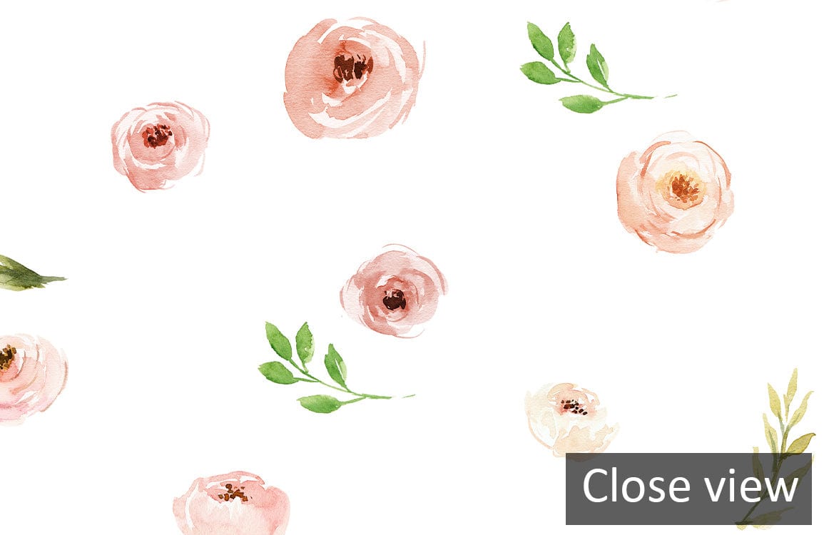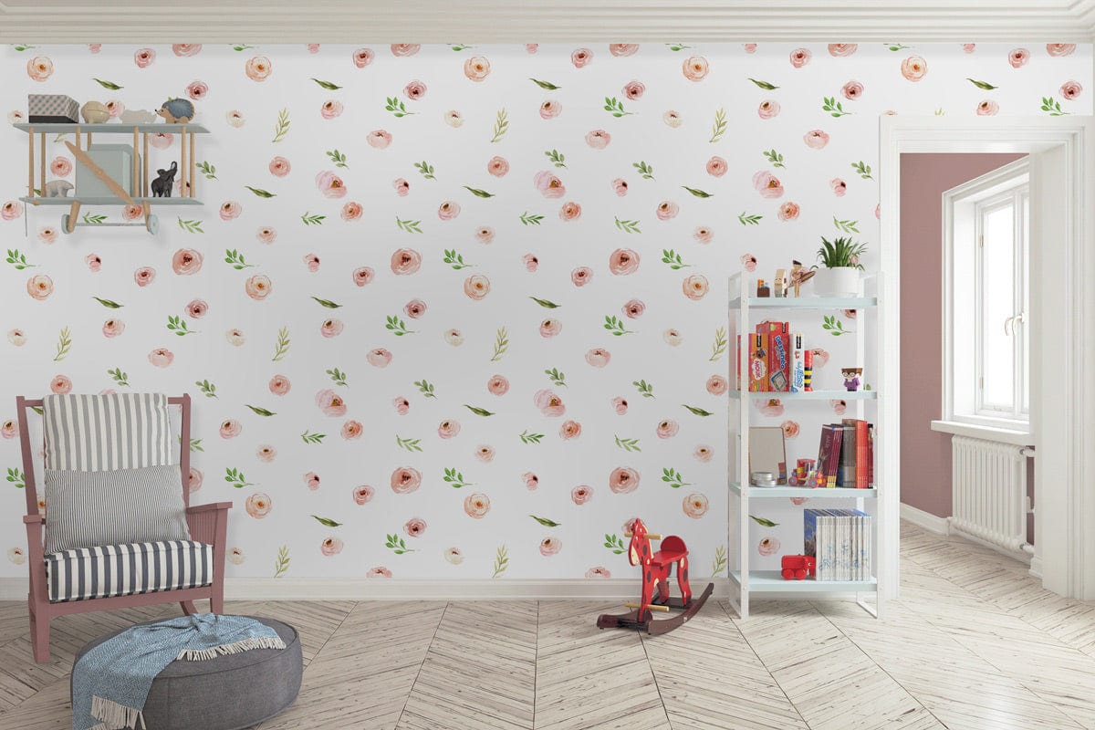The Blush Rose Harmony Mural Wallpaper exudes elegance with delicate blooms and verdant leaves set against a gentle white backdrop. This artful composition provides a tranquil ambience that seamlessly integrates into both classic and contemporary interiors, offering a timeless allure.