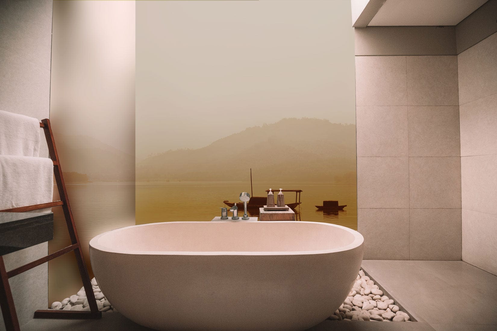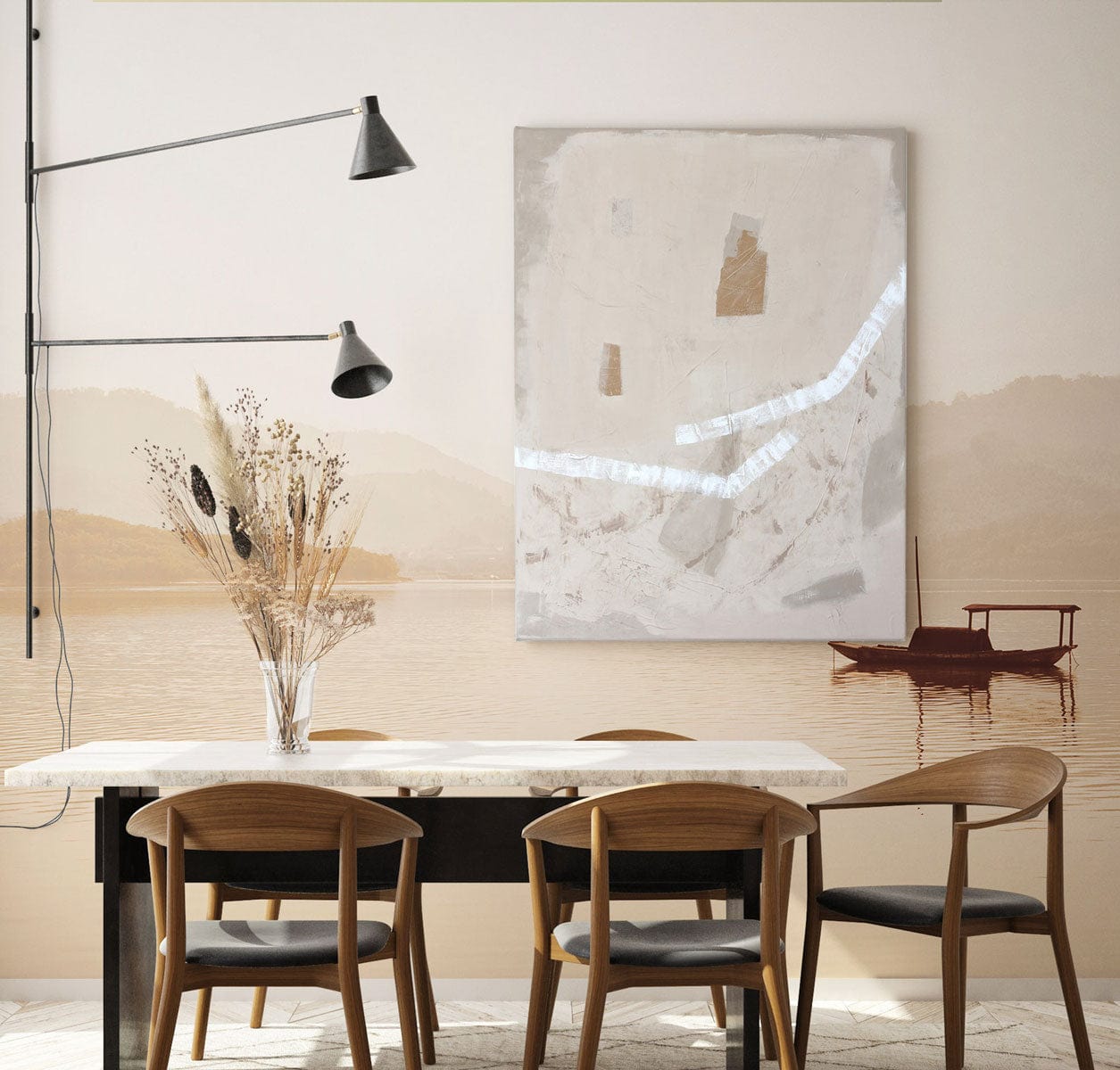 Embrace the serene beauty of nature with the Boat on Lake Wallpaper Mural. This exquisite design captures a tranquil scene where gentle mist envelops distant hills, mirrored softly by the calm waters. The delicate interplay of light and shadow creates an ethereal ambience, inviting a sense of peace and introspection into any room. Perfect for creating a backdrop that exudes both sophistication and warmth.
