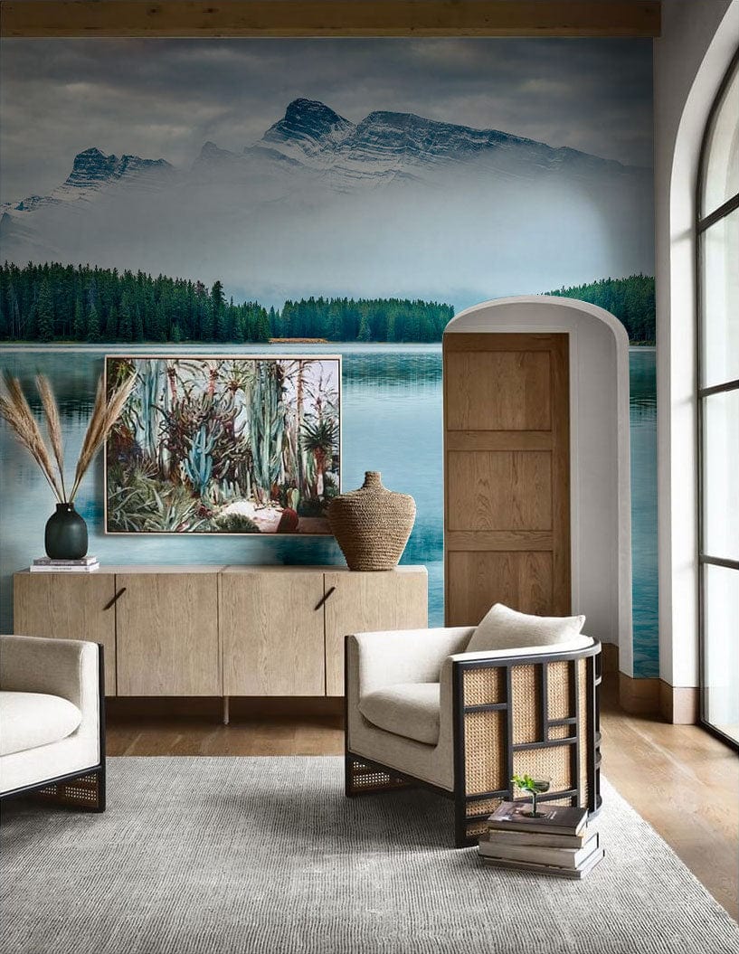 Immerse your interior with the Boundless Landscape Wallpaper Mural, where serene waters meet majestic, mist-shrouded peaks. The panoramic vista, enriched with subtle textures, evokes a sense of tranquillity and grandeur, making it a captivating addition to any home. Perfectly suited for those seeking a harmonious blend of nature's splendour with sophisticated design.