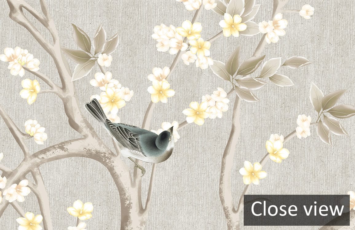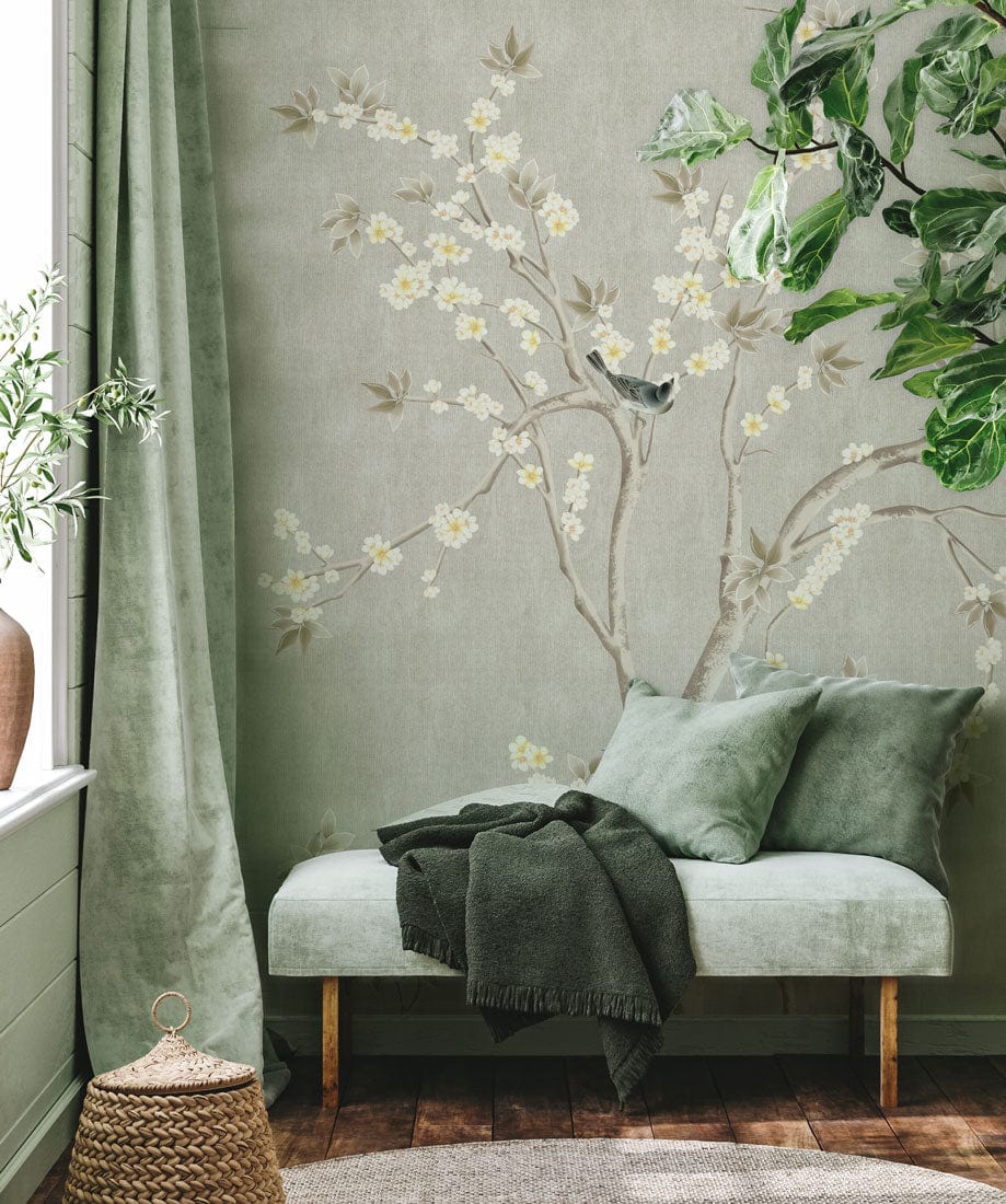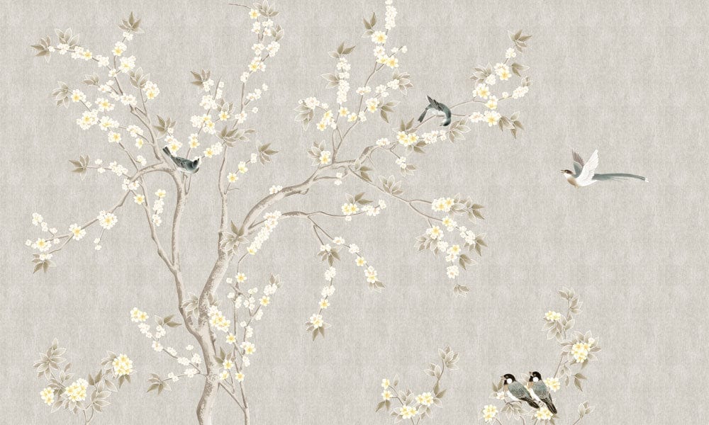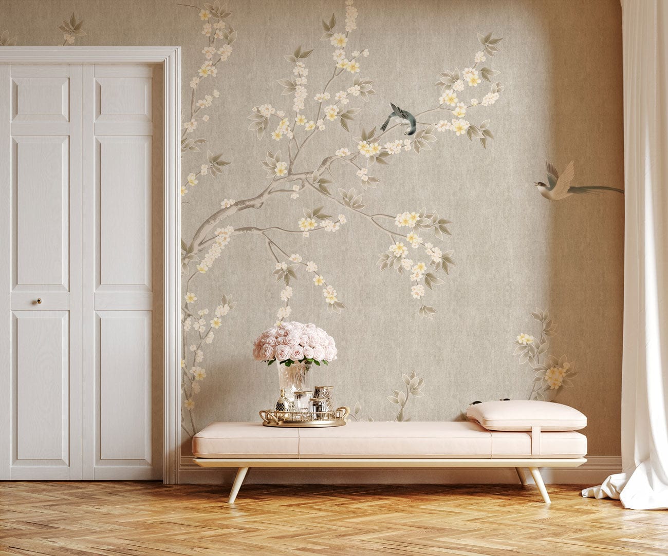 The Branch Aroma Wallpaper Mural presents a serene fusion of nature and artistry, featuring delicate blossoms and graceful birds rendered on a muted background. Its intricate detailing and subtle hues evoke a sense of tranquillity, perfect for adding a touch of elegance to any interior. Ideal for creating a peaceful and sophisticated ambience, this mural effortlessly complements a variety of décors.