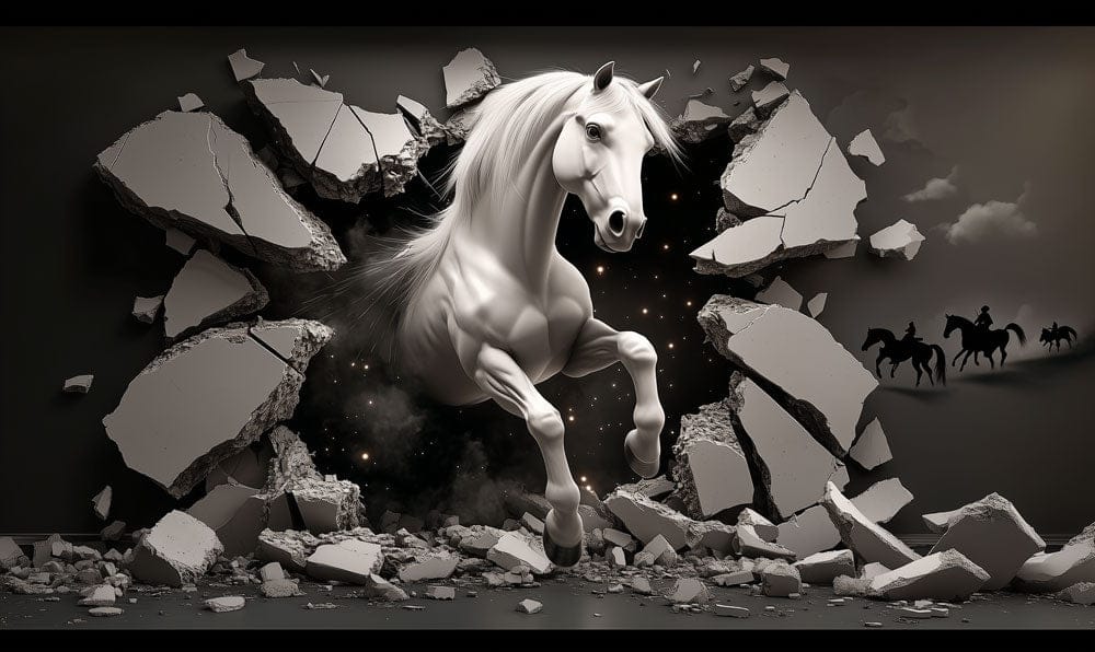 Breakthrough White Stallion Mural Wallpaper creates a dramatic 3D illusion of a powerful white horse bursting through a cracked wall, surrounded by flying stone and glowing sparks. The dark, cinematic background adds depth and energy for a bold statement. Perfect for game rooms, man caves, offices, entryways, or feature walls.