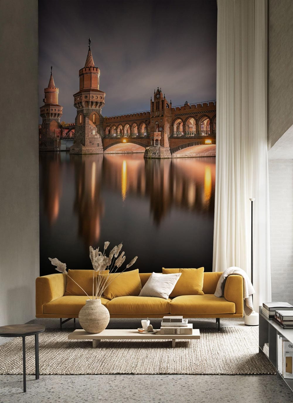 Capture the architectural grandeur of Berlin with this sophisticated wallpaper mural featuring the iconic bridge reflecting over tranquil waters. A harmonious blend of deep greys and soft ambers, this mural brings urban elegance and a sense of serenity to any interior space. The intricate details and subtle textures evoke a timeless charm, perfectly suited for modern and vintage aesthetics alike.