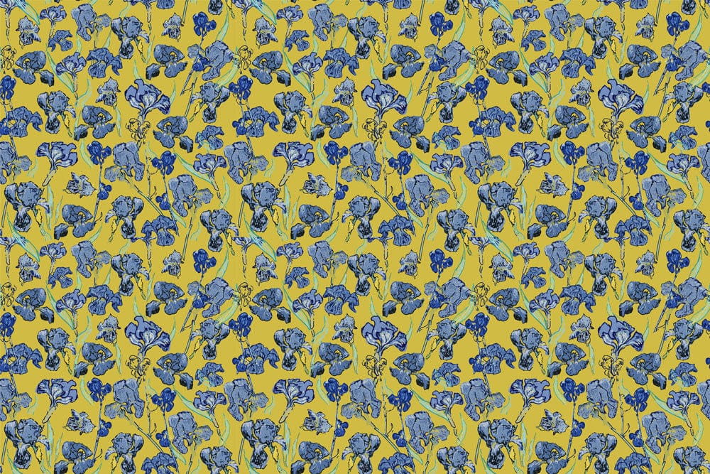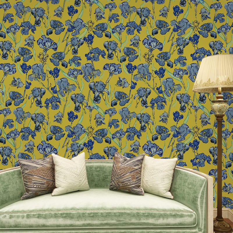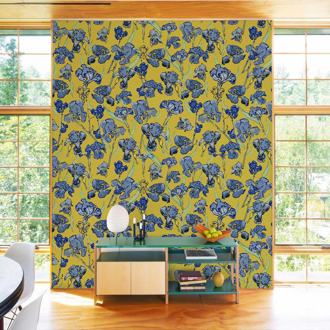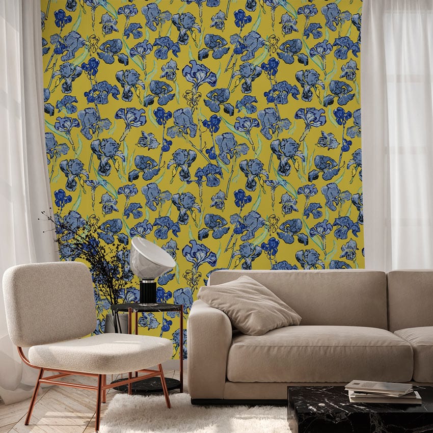 The Bright Iris Bloom Mural Wallpaper captures the eye with its exquisite floral design, echoing the grace and beauty of iris flowers dancing against a golden backdrop. Intricate blue petals interweave with delicate stems, creating a serene yet striking visual statement. This mural suits a variety of interior settings, imparting a sense of timeless elegance and artistic charm.