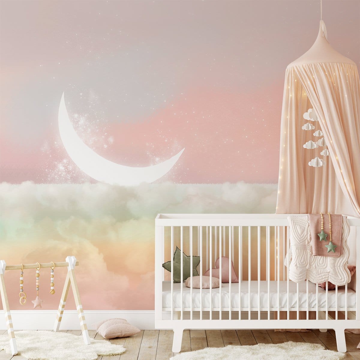 Immerse yourself in the celestial serenity of the Bright Moon Wallpaper Mural, where a glowing crescent is elegantly suspended over a horizon of pastel clouds. This artwork captures the delicate palette of soft pinks, creams, and gentle blues, evoking a sense of floating tranquility. Its ethereal beauty and refined design make it an exquisite choice for those seeking to grace their interiors with a touch of timeless sophistication.