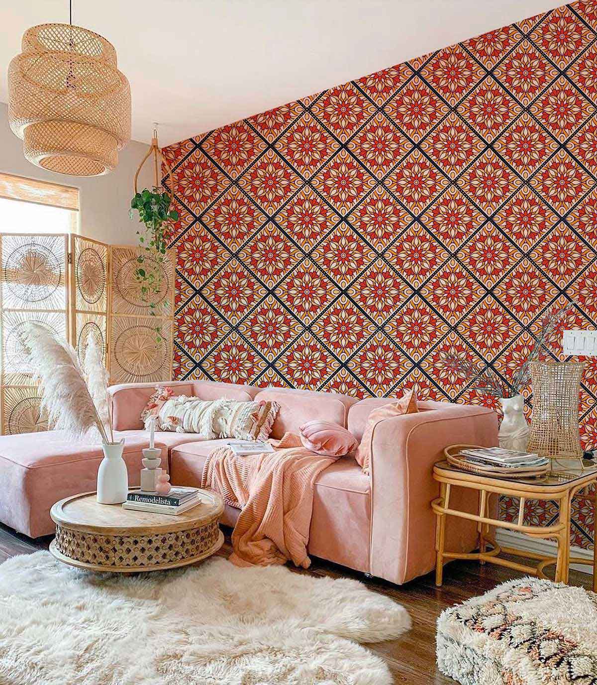 Delve into a realm of elegance with the Bright Orange Vectors Wallpaper Mural, where intricate geometric patterns entwine with a vivid tapestry of hues. The design's rhythmic repetition exudes a sense of harmony and balance, making it an exquisite choice for interiors that seek both vivacity and grace. Its rich textures and compelling motifs capture an artistic flair, lending a sophisticated yet inviting ambience to any room.