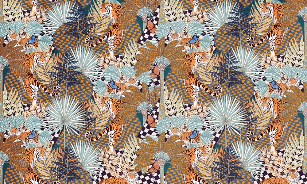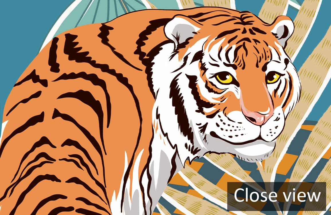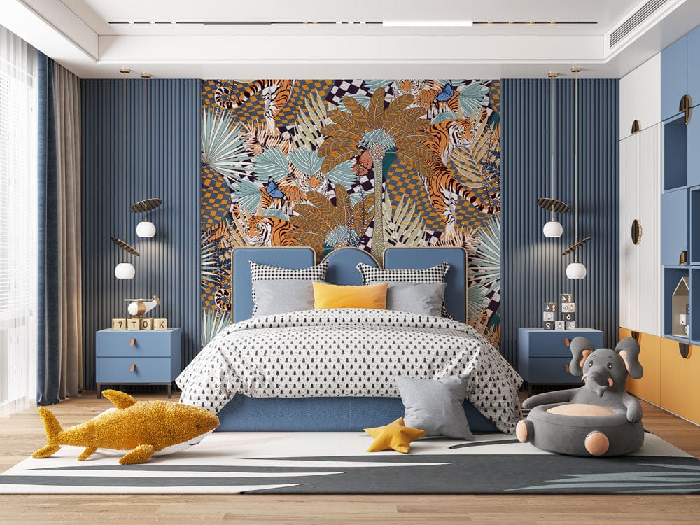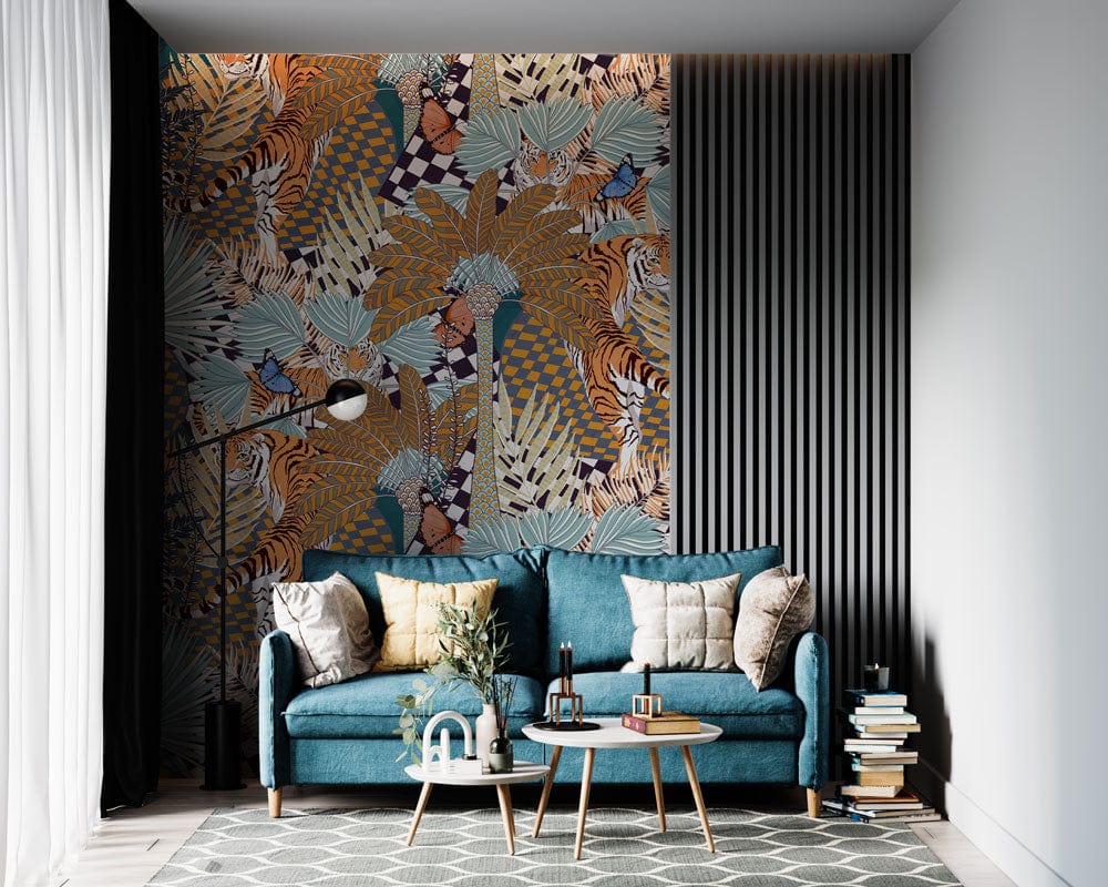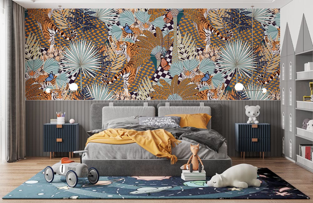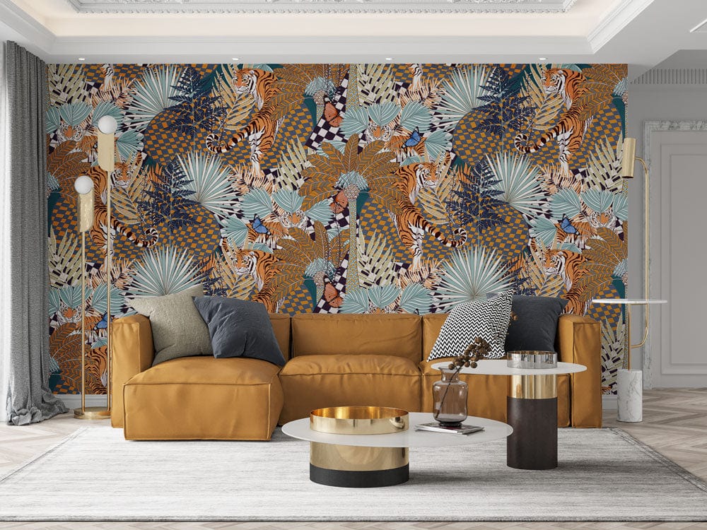 Immerse your space in the captivating allure of the Brown Abstract Tiger Jungle Wallpaper Mural. This intricate design seamlessly blends dynamic tigers with lush botanicals, presenting a striking visual tapestry. With earthy browns, soft blues, and deep greens, this mural evokes the depth and mystery of a jungle landscape. Perfectly suited for an eclectic interior, the wallpaper adds a touch of wild sophistication to any setting.