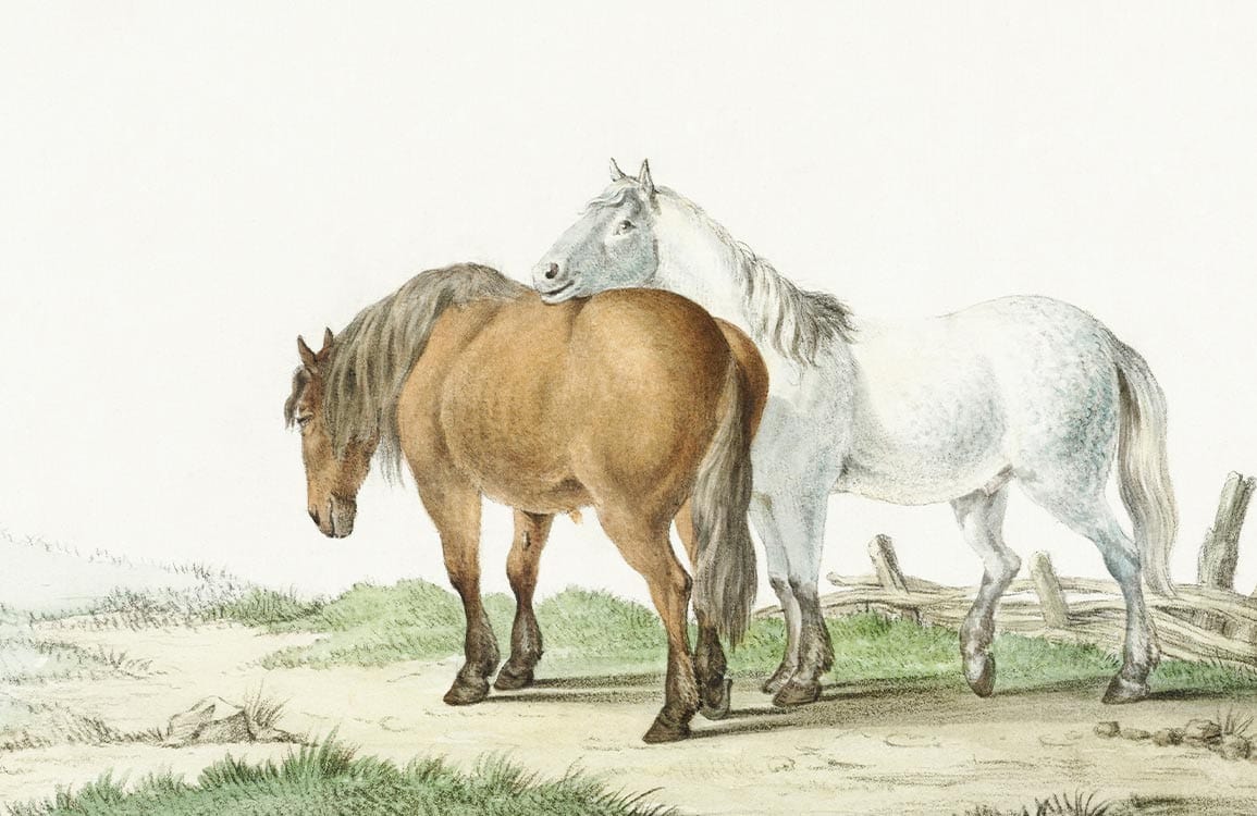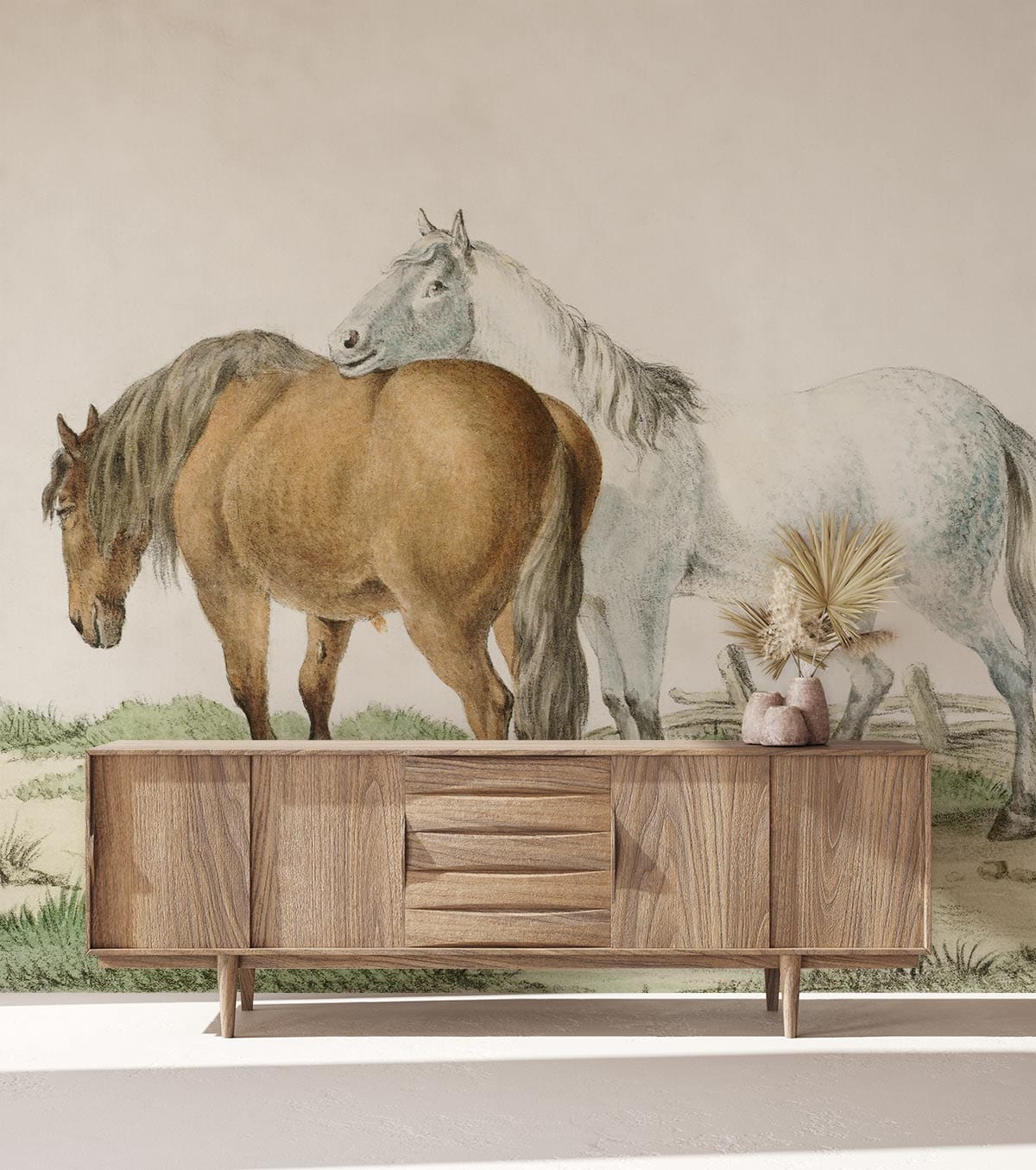 Immerse yourself in the gentle countryside with this brown and white wallpaper mural, where two majestic horses stand gracefully against a serene pastoral backdrop. The delicate strokes and soft colour palette evoke a sense of calm, making it an exquisite addition to any interior space yearning for a touch of rural elegance. Perfect for creating an inviting ambience, this mural seamlessly complements both classic and contemporary settings.