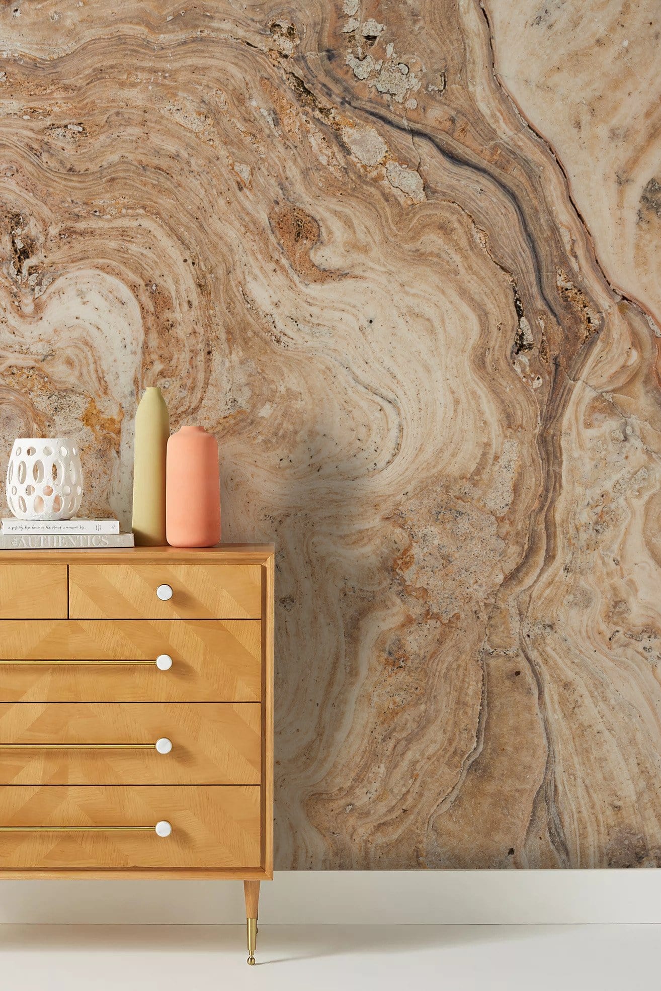 Pastel brown colour stone is cut with yellow veins to create a visually stunning slab of calacatta marble. Elegant and confident, this wall mural captures the variety and complexity of natural stone. Wall mural available in both removable peel-and-stick and permanent wallpapers. Printed with child-safe inks.