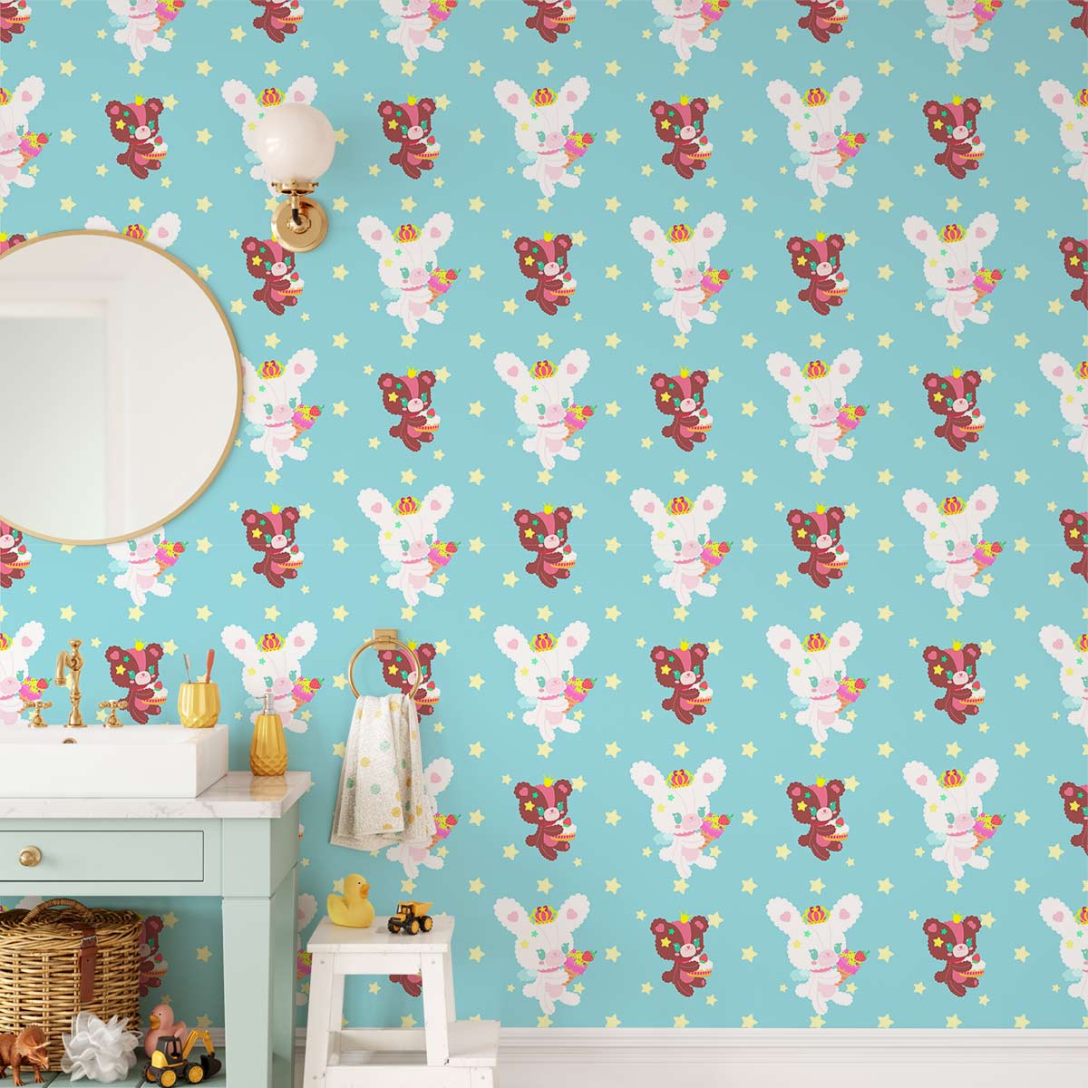 The Bunny & Bear Wallpaper Mural presents a delightful fusion of whimsy and charm, featuring playful bunnies and bears adorned with crowns amidst twinkling stars. Set against a serene aqua backdrop, its intricate detailing lends an enchanting quality suitable for a range of interiors, from a child's sanctuary to a creative studio space. Its imaginative and colourful design adds a touch of playful sophistication, effortlessly bridging the gap between youthful exuberance and artistic finesse.