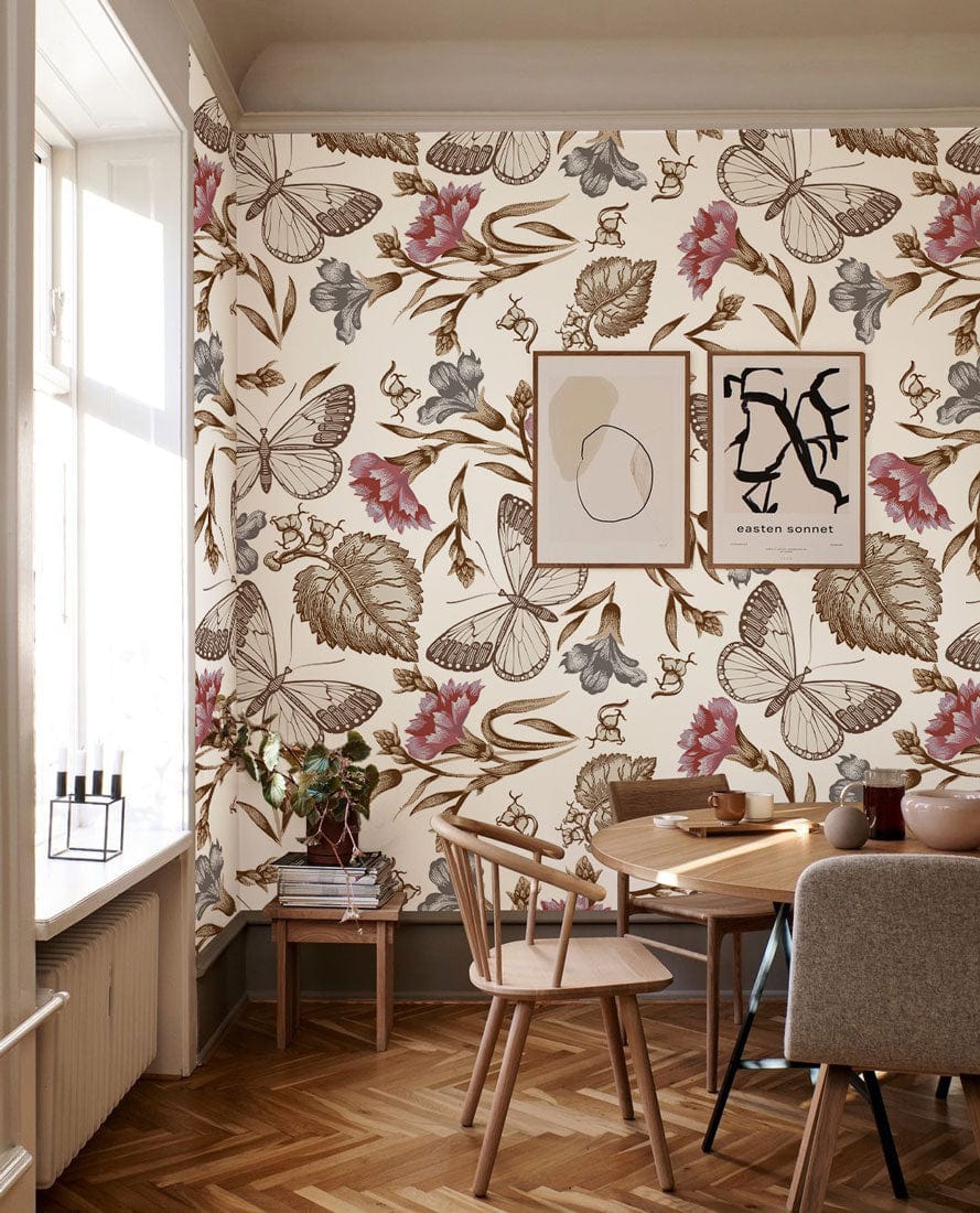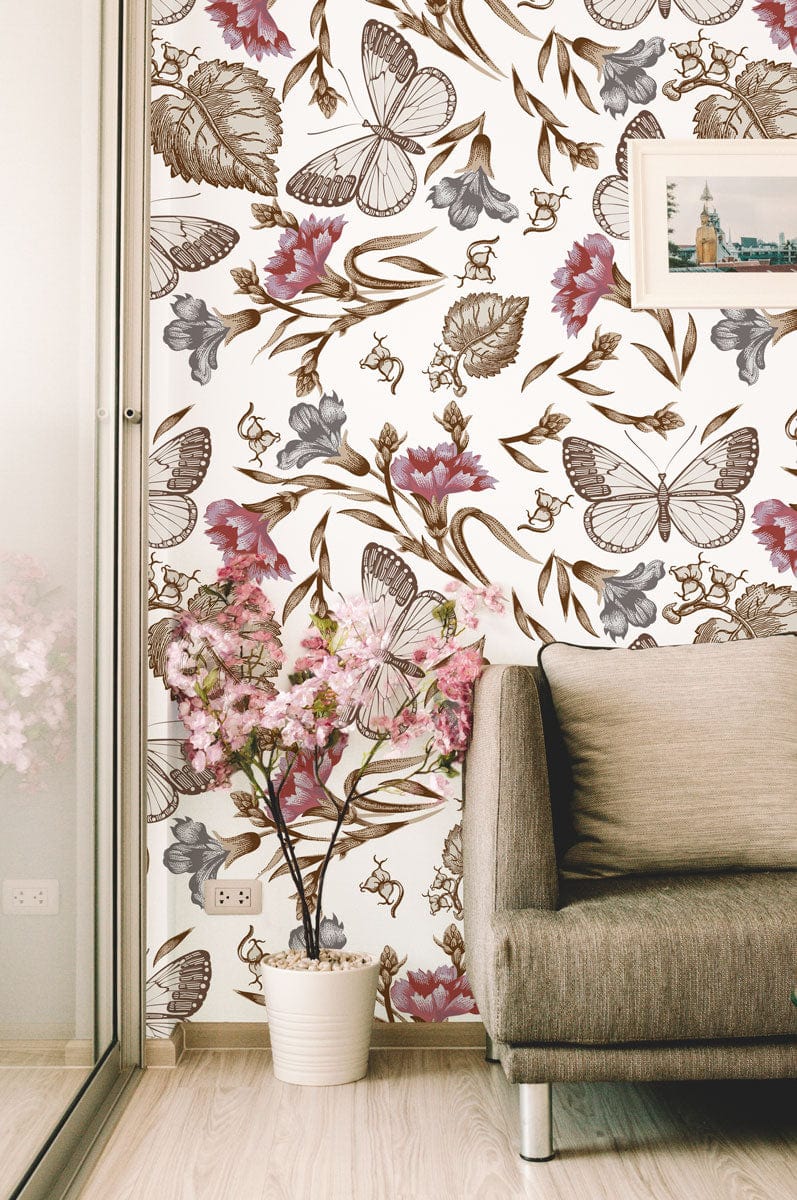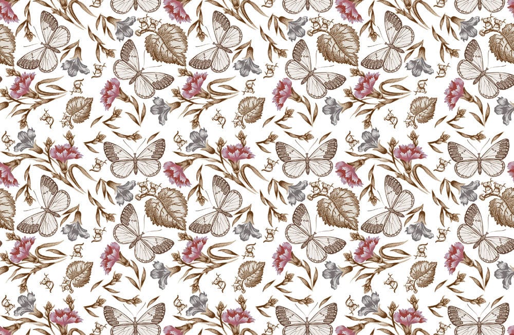 Immerse your space in a gentle dance of elegance with the Butterflies & Flowers Wallpaper Mural. Delicately sketched butterflies flutter amongst intricately detailed blossoms, capturing nature's beauty in refined detail. The subtle earthy tones and delicate florals provide a timeless backdrop, suitable for both traditional and contemporary settings.