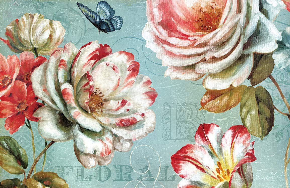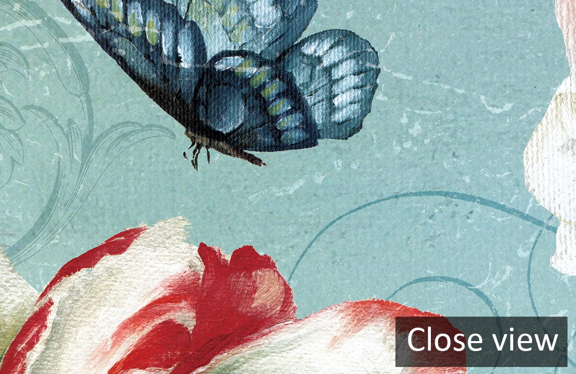 Immerse your space in a delicate dance of roses and azure butterflies with this exquisite wallpaper mural. The intricate brushstrokes and subtle play of light evoke a serene garden setting, making it a sublime choice for artful interiors. Its balanced palette seamlessly complements both contemporary and classic decor, offering an atmosphere of quiet elegance.