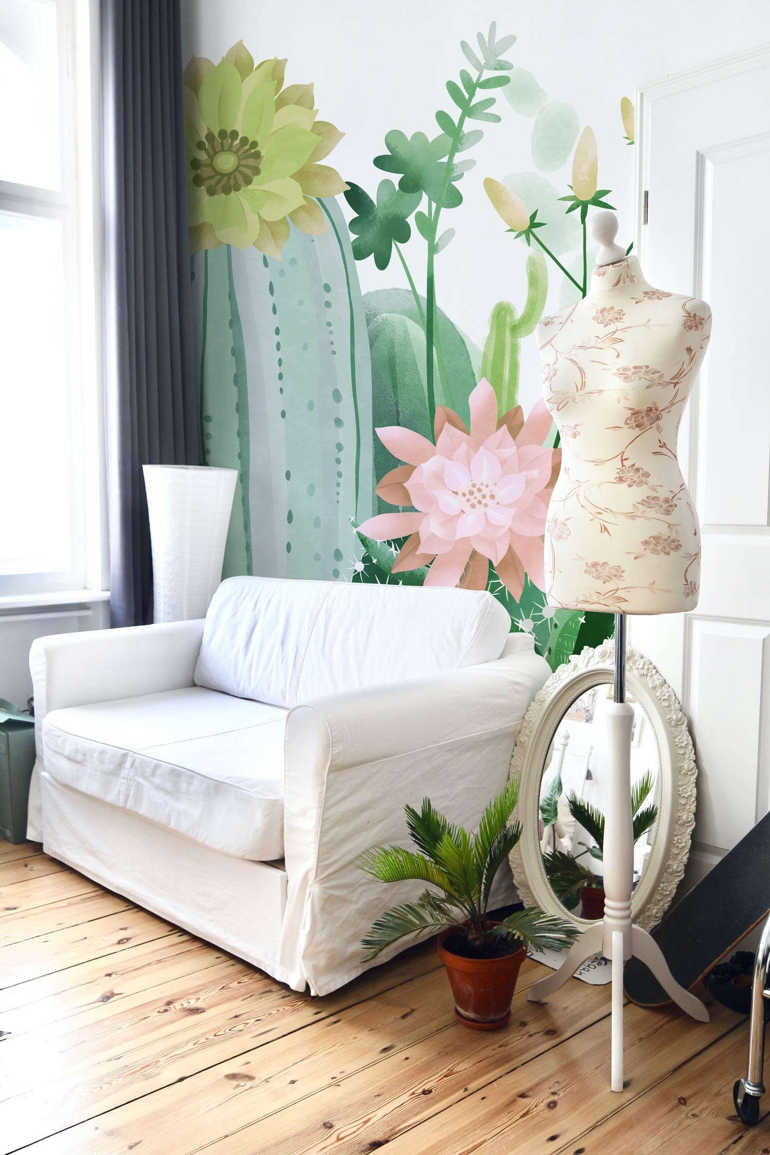 Adorn your wall with this cactus and flower wallpaper mural. Let these green cactus and colourful flowers surround you and bring your rooms a fresh appeal. This gorgeous botanical wallpaper will guarantee to spice up your interior space with its simple aesthetics. Works well in a wide ranges of rooms such as living room, bedroom and dining hall.